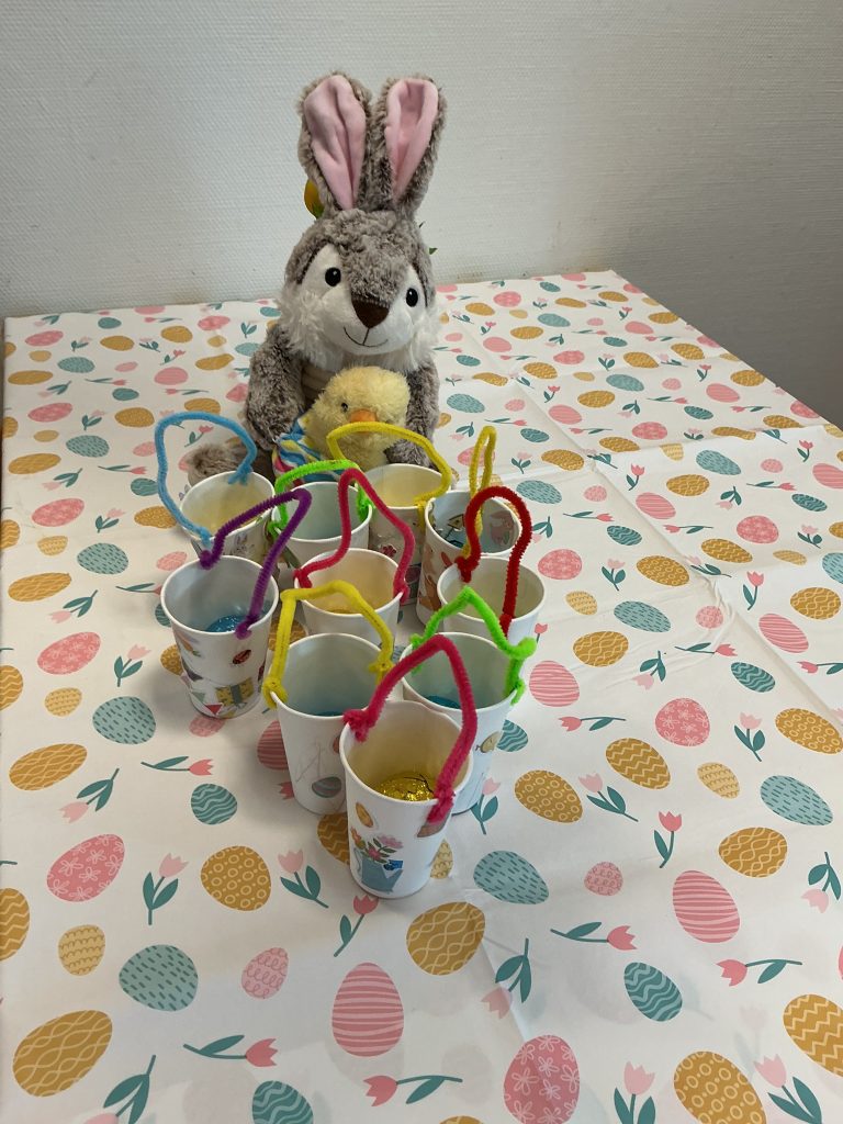 Alle peuters hebben een paasmandje versiert. Dit mandje is vanmorgen door de paashaas gevuld met een chocolade ei!