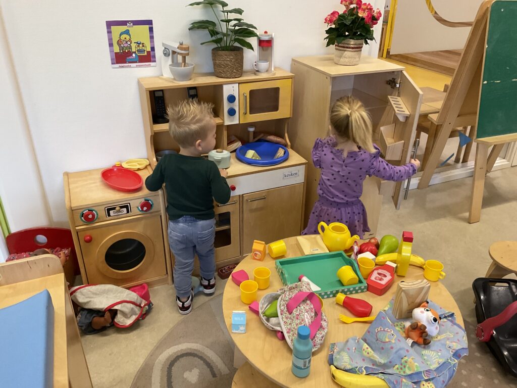 Welk thema we ook hebben, de huishoek blijft een hele populaire plek om lekker te spelen! Eten koken, de poppen verzorgen, de was doen, afwassen, alles van thuis wordt nagespeeld: doe-alsof-spel.