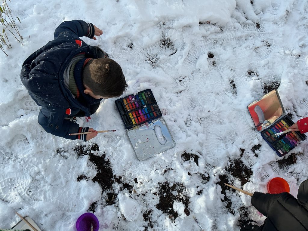 Als de baby’s niet naar buiten kunnen dan halen we buiten gewoon naar binnen. Lekker spelen met sneeuw; het is nat en koud brrrr.
