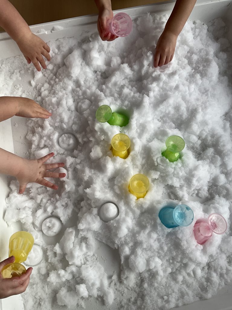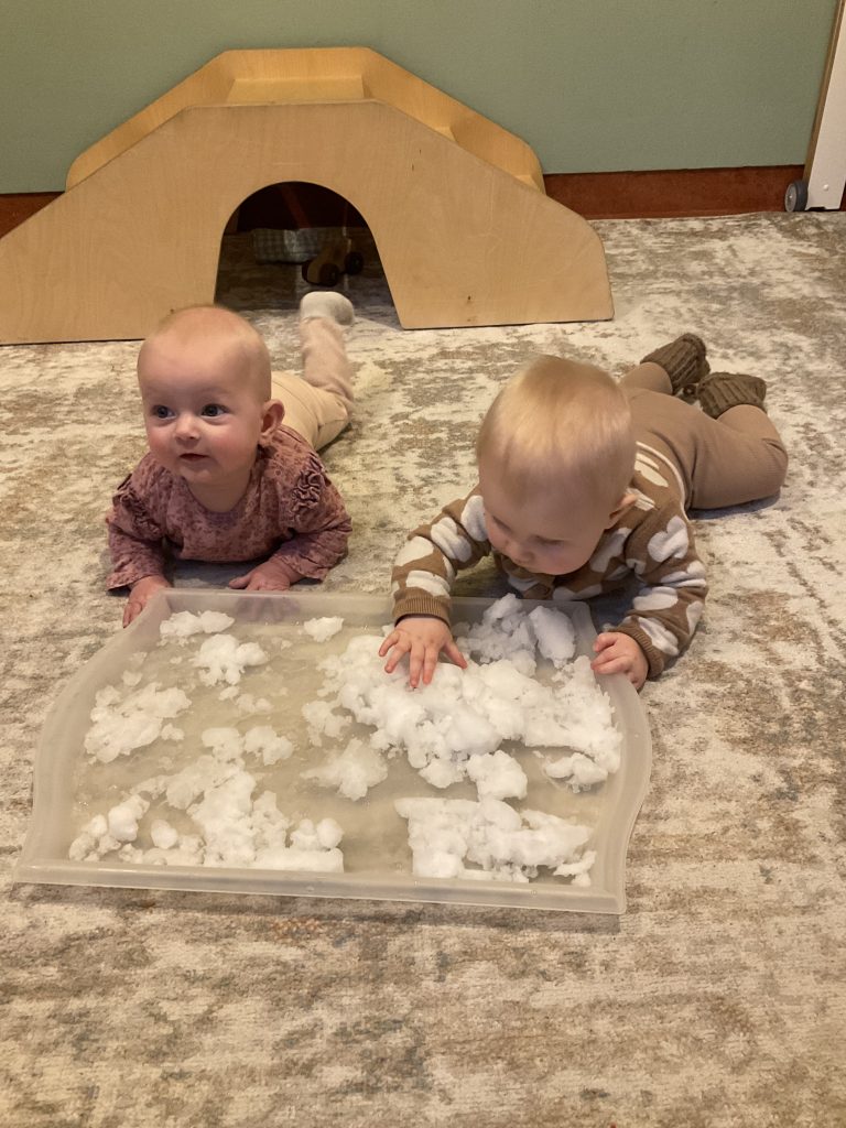 De sneeuw is binnen ook heel leuk! Voelen, scheppen en wat gebeurt er als je er in knijpt?