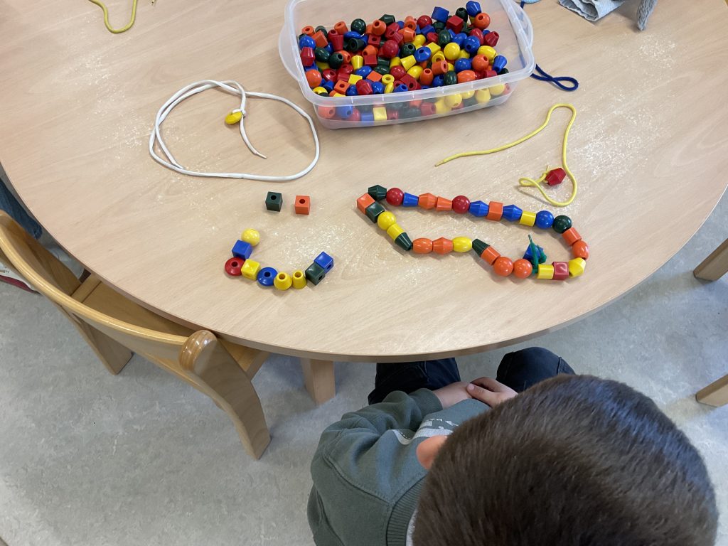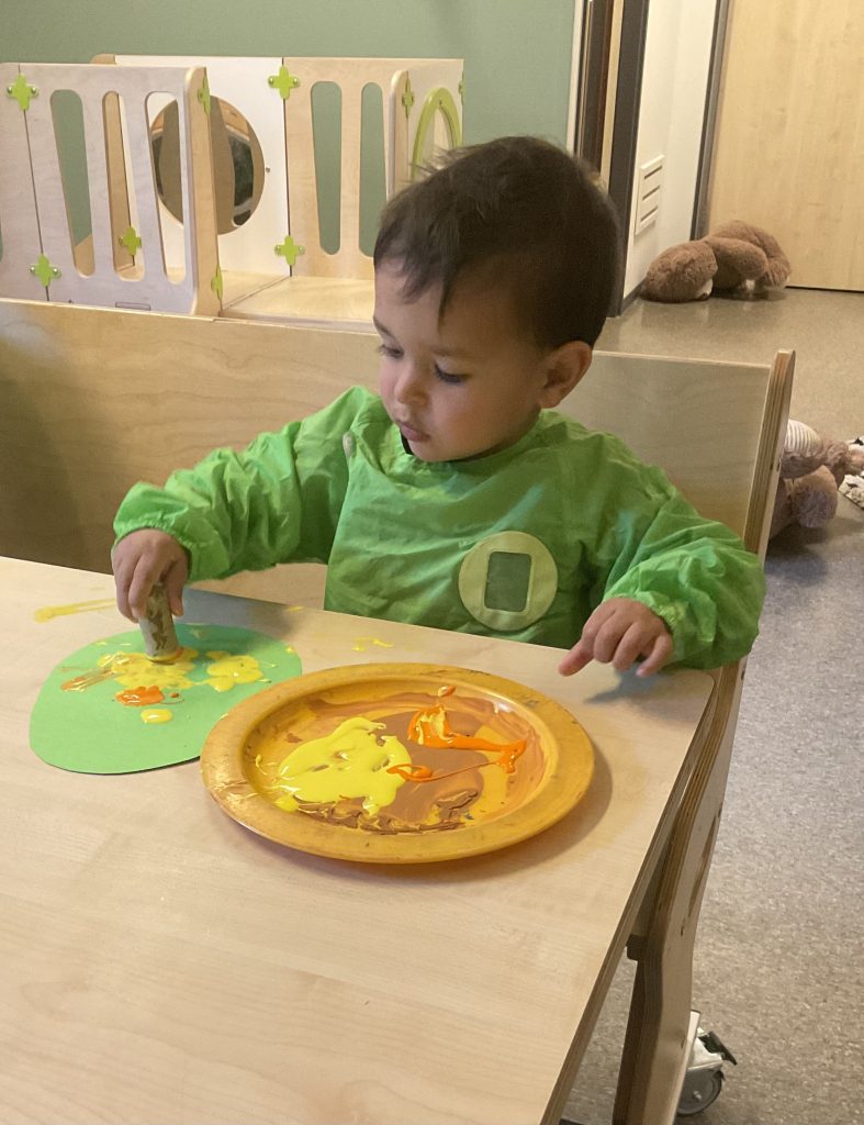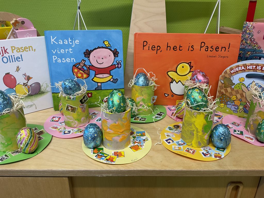 Het is al bijna Pasen. De kinderen verven mooie gekleurde stippen op het ei.