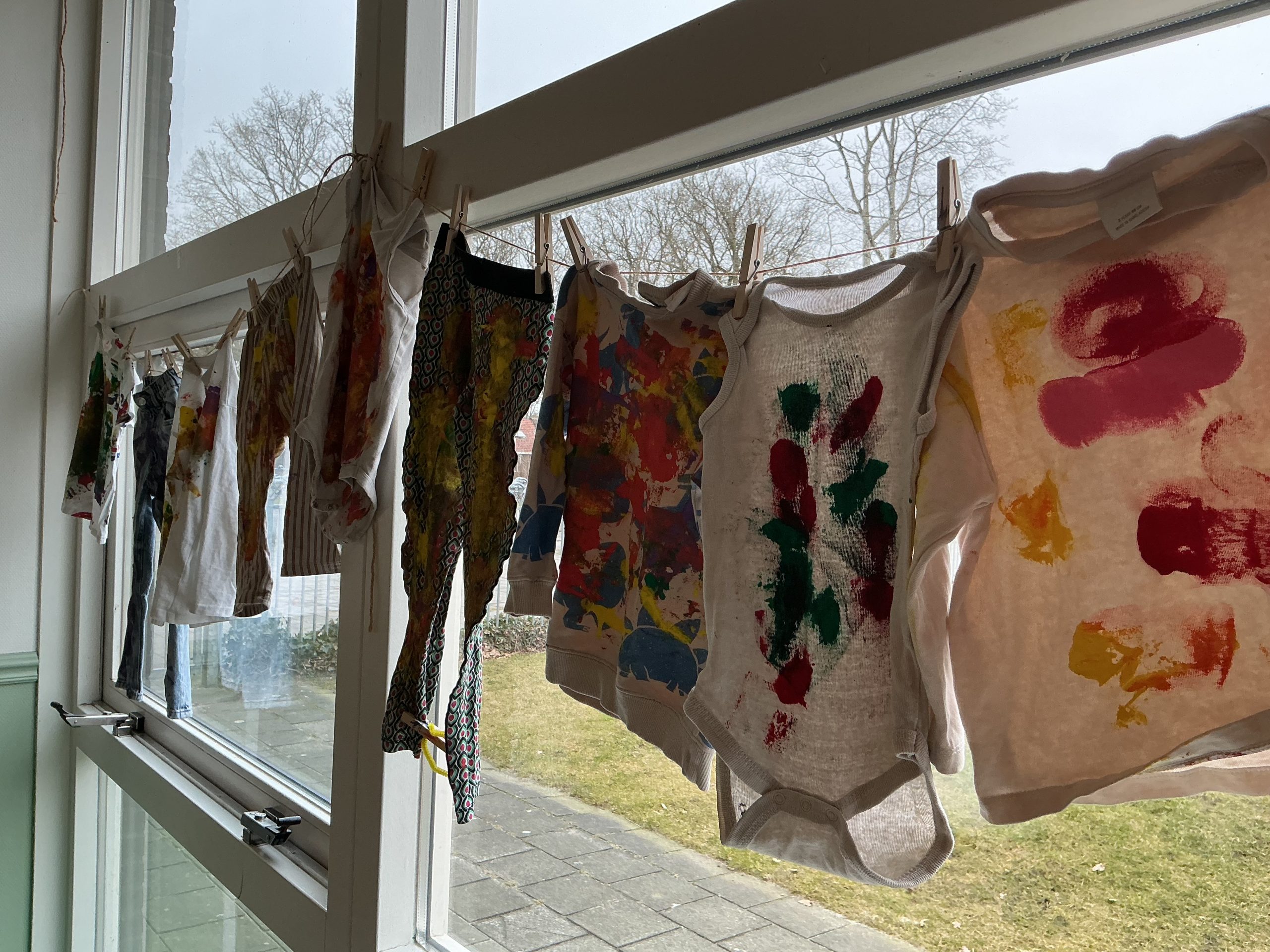 Alle kinderen namen een kledingstuk van huis mee om te pimpen met textielverf. Nu hangen ze aan de waslijn te schitteren. Wat een kleurrijk resultaat!