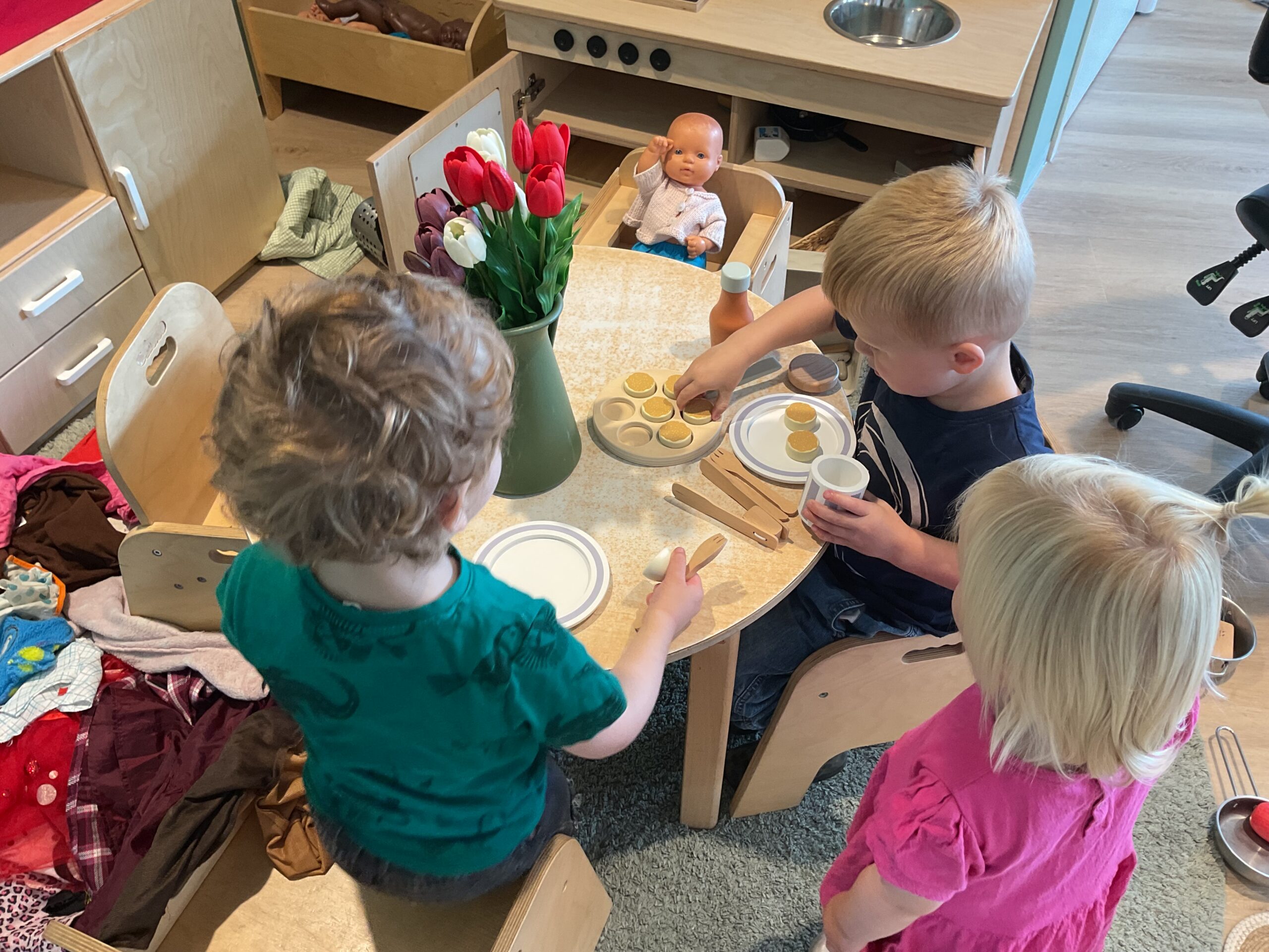 Met het thema “ik hou van Holland” hebben we in de huishoek een poffertjespan. Nu kunnen we de hele dag poffertjes bakken! Ook staan de tulpjes gezellig op tafel.