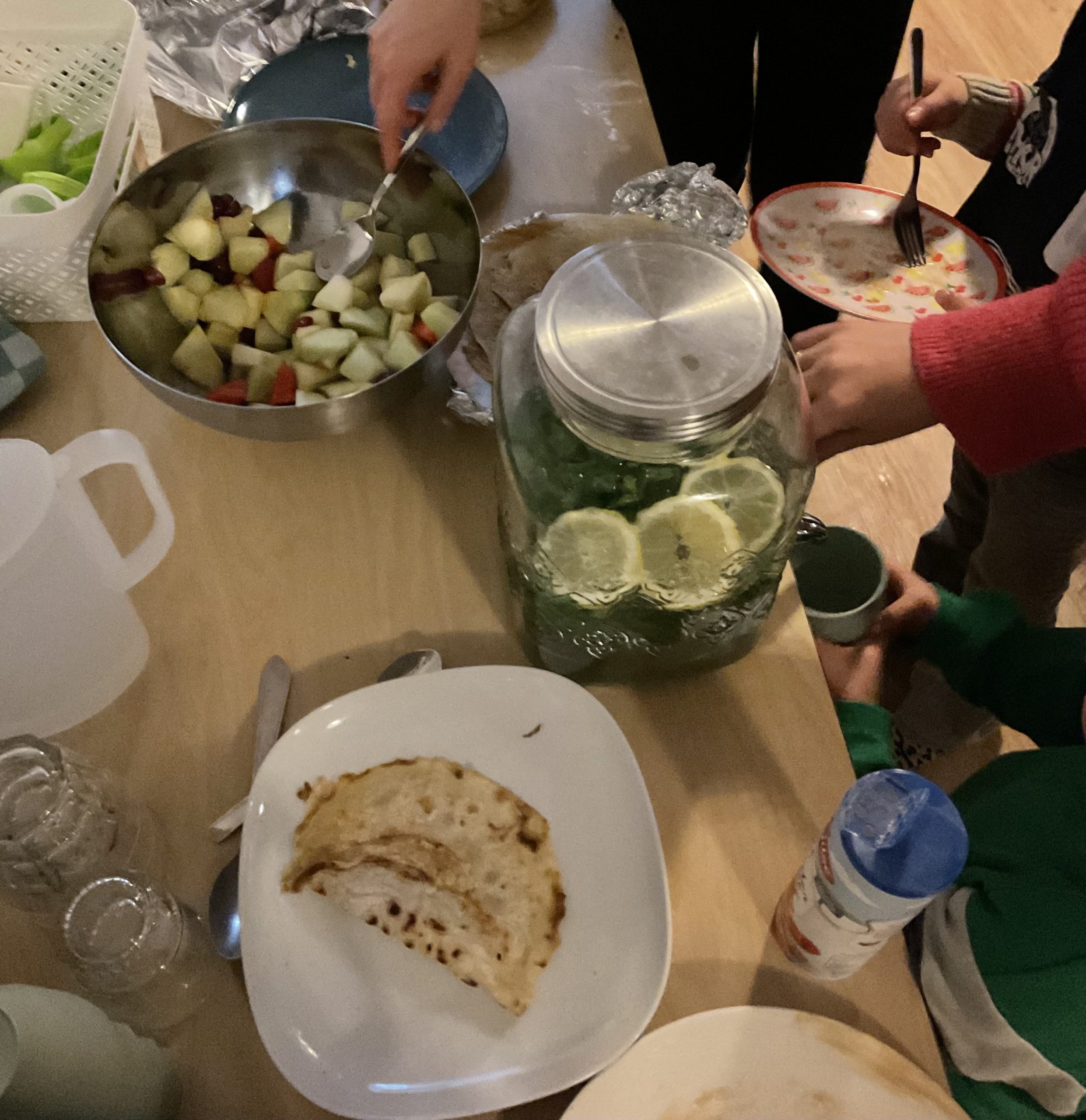 Vandaag vierden we met alle kinderen en ouders een pannenkoekenfeest. Alle kinderen hadden thuis of op de opvang meegeholpen met bakken.