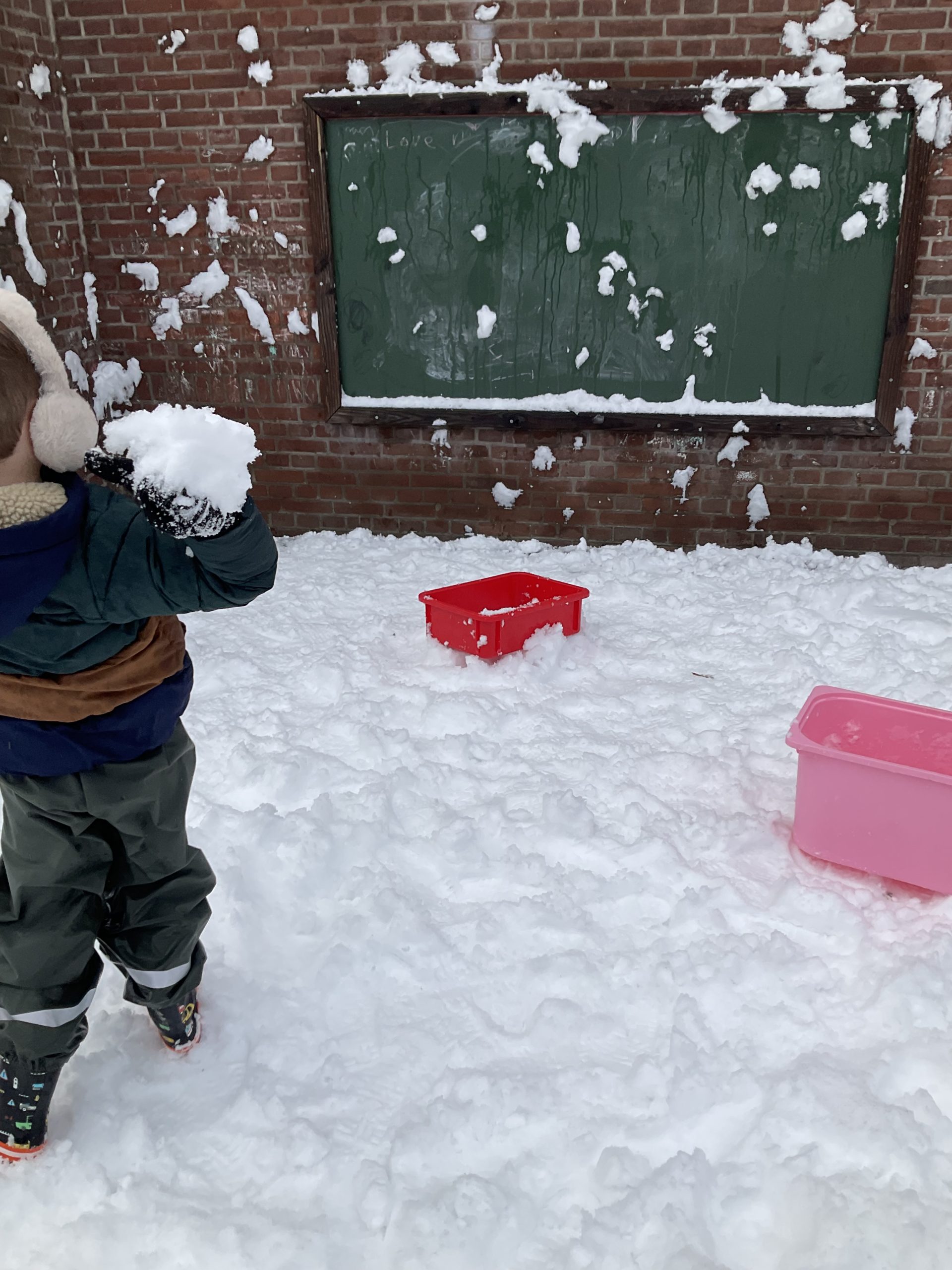 Sneeuwballen gooien op de muur. En het leukste is dat de sneeuwballen blijven plakken op de muur.