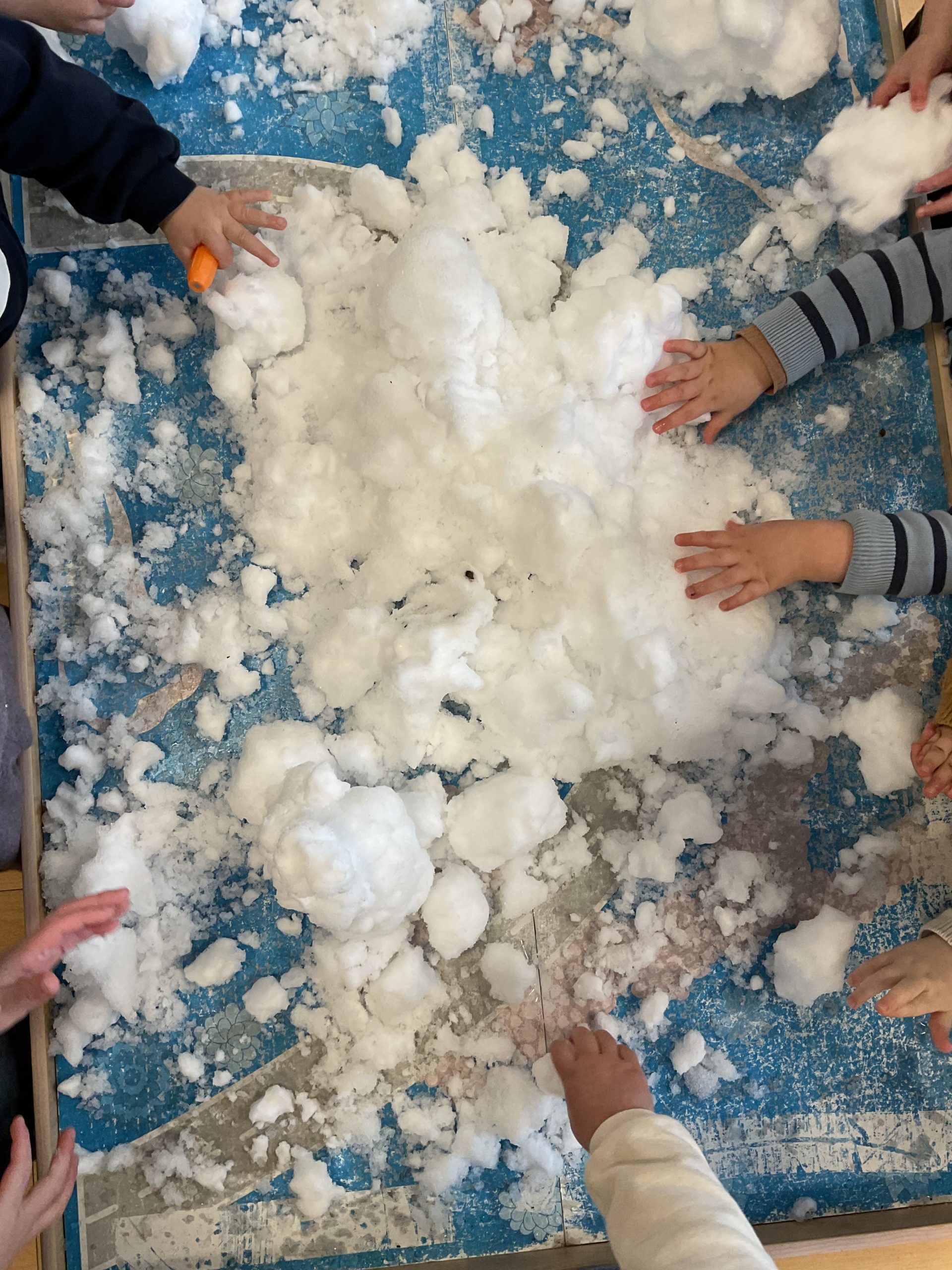 Heerlijk binnen genieten van de sneeuw. Ontdekken wat er gebeurt wanneer sneeuw smelt, wat blijft er dan over? Het is wel een beetje koud aan de handen brrrr…
