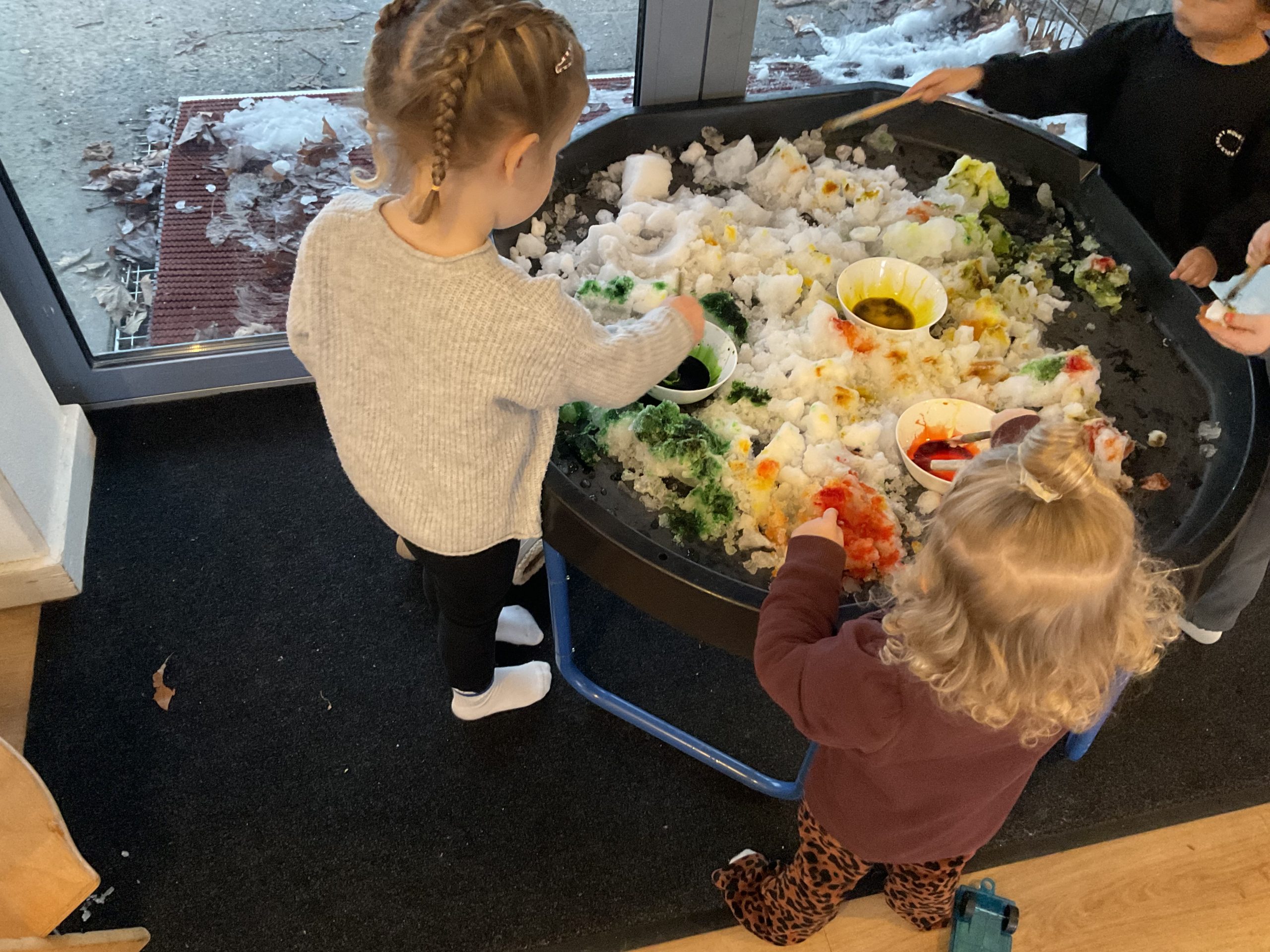 We haalden de sneeuw naar binnen en speelden samen met verschillende kleuren. Zo ontstond een prachtig kunstwerk!