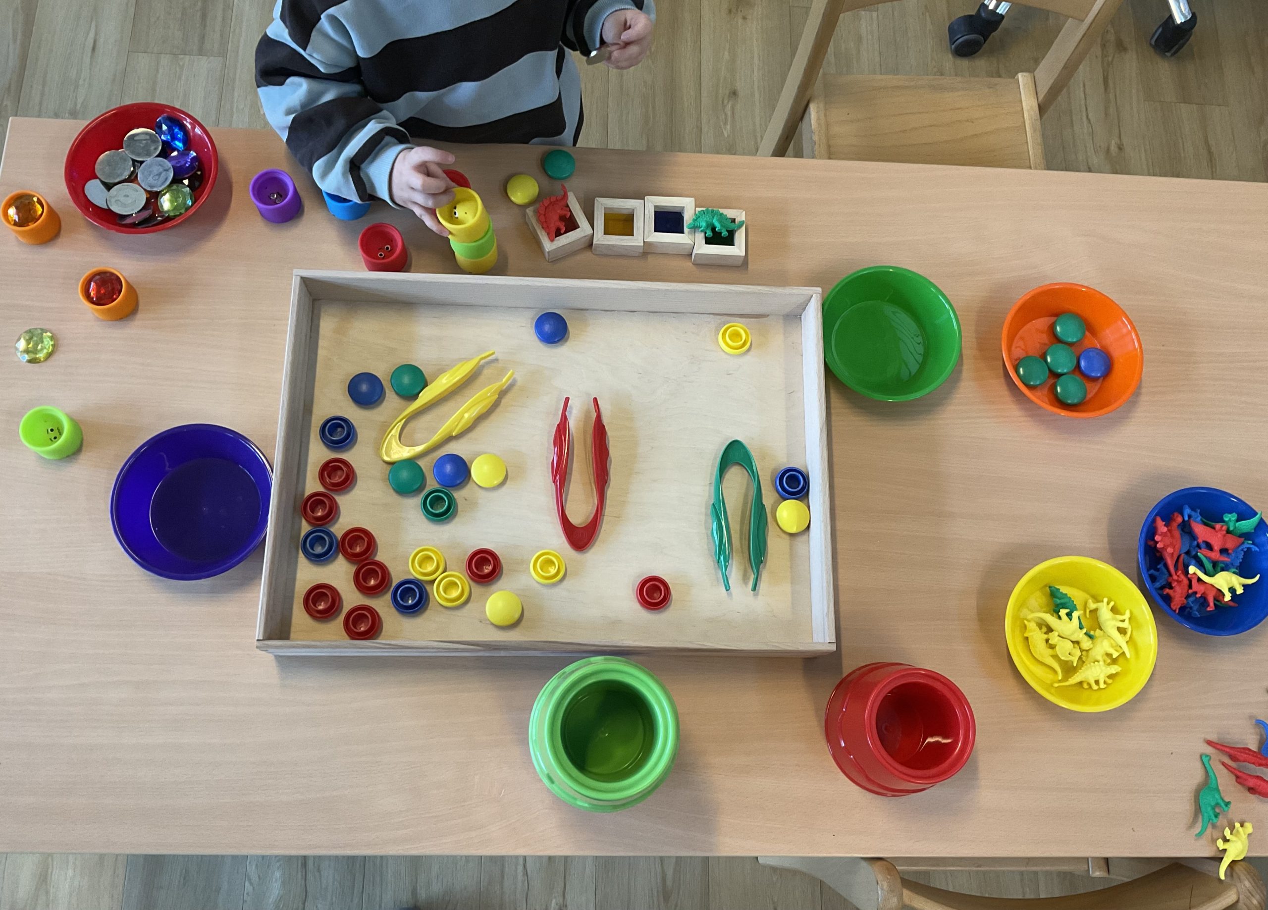 We spelen met het nieuw aangeschafte sensomotorische materiaal en ontdekken al doende wat je er allemaal mee kunt.