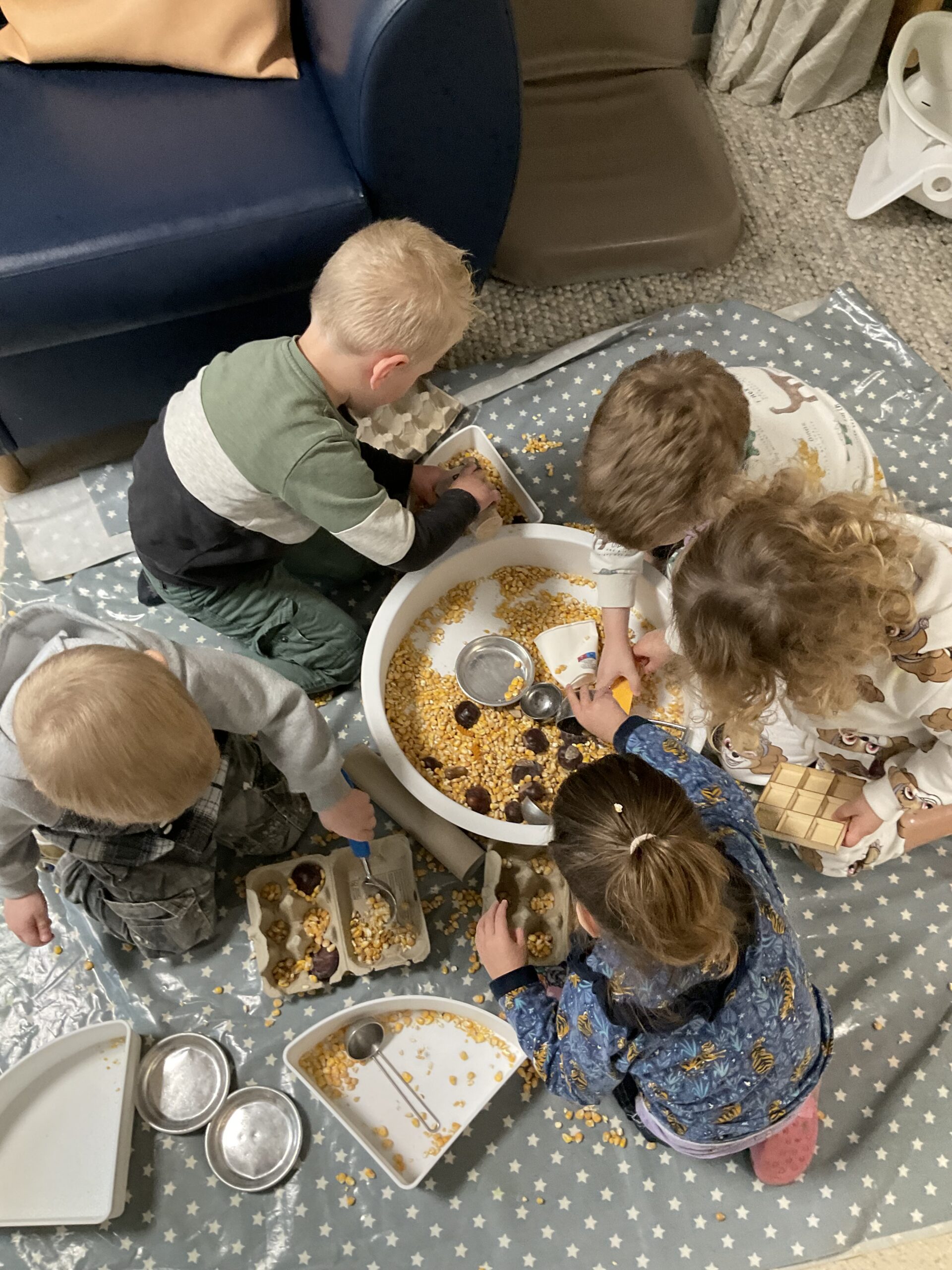 Heerlijk op ontdekking met de mais en kosteloos materiaal. Bakjes en eierdozen vullen en legen. Wat kunnen we er allemaal mee?