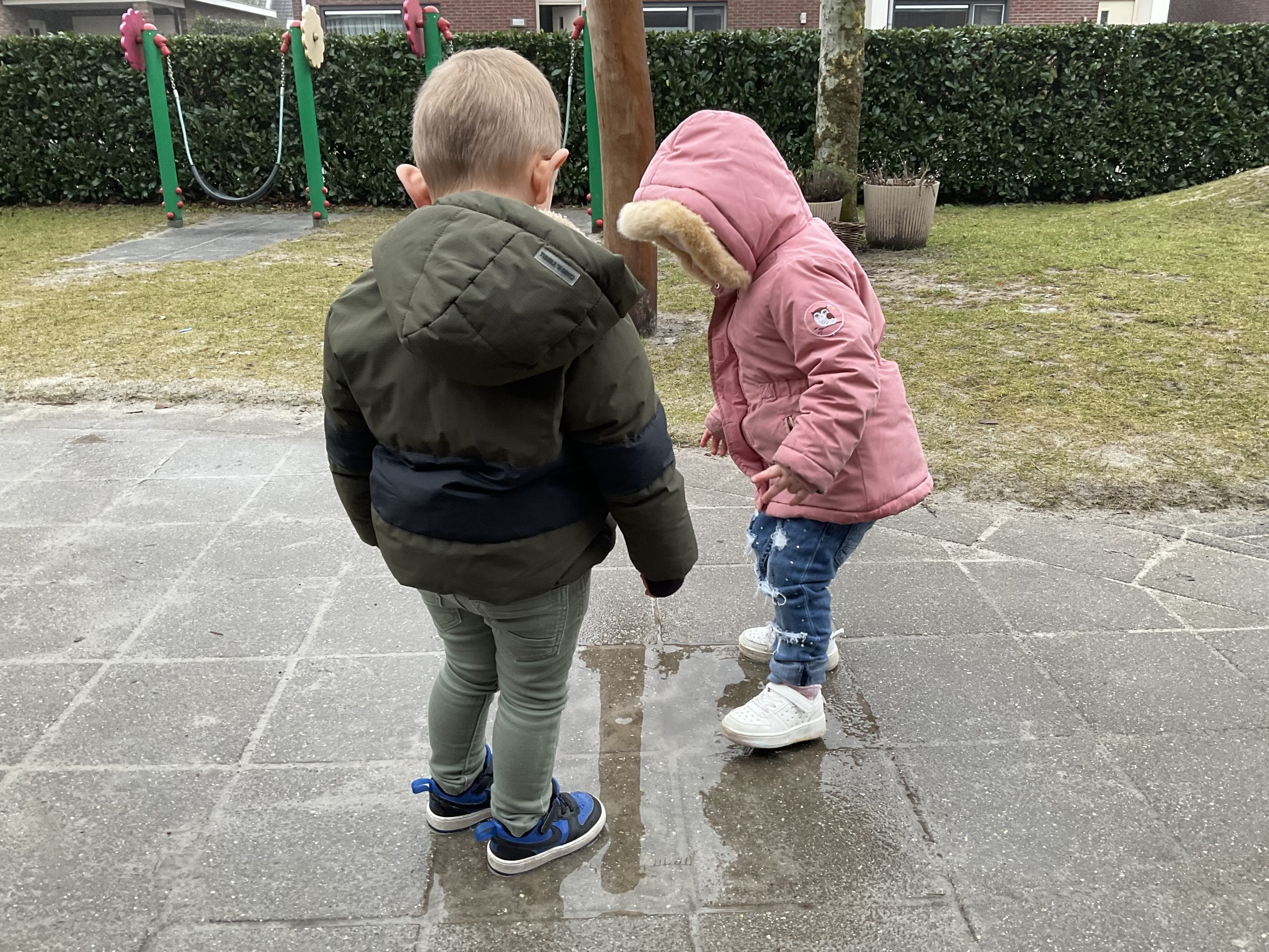 Vanmiddag is het gelukkig droog, nadat het vanmorgen steeds heeft gemiezerd. Wat is er dan leuker dan stampen in de plassen? Niets! Lekker nat worden en daarna weer schone kleren aan.