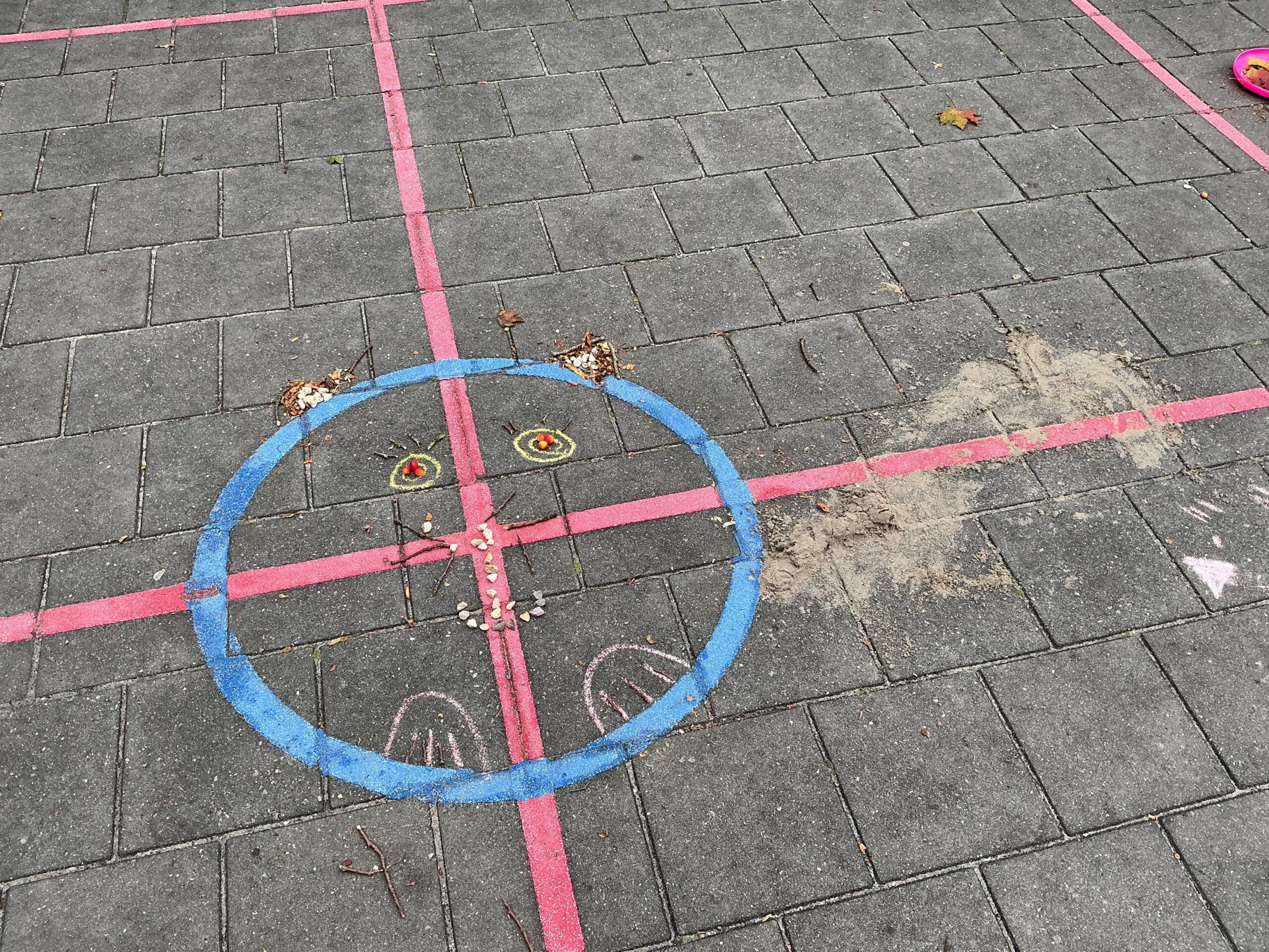 De opdracht was, maak met natuurlijke materiaal een leuk dier en zet dat op de foto. Met takjes, bladeren, steentjes en stoepkrijt hebben de kinderen een leuke kat gemaakt.
