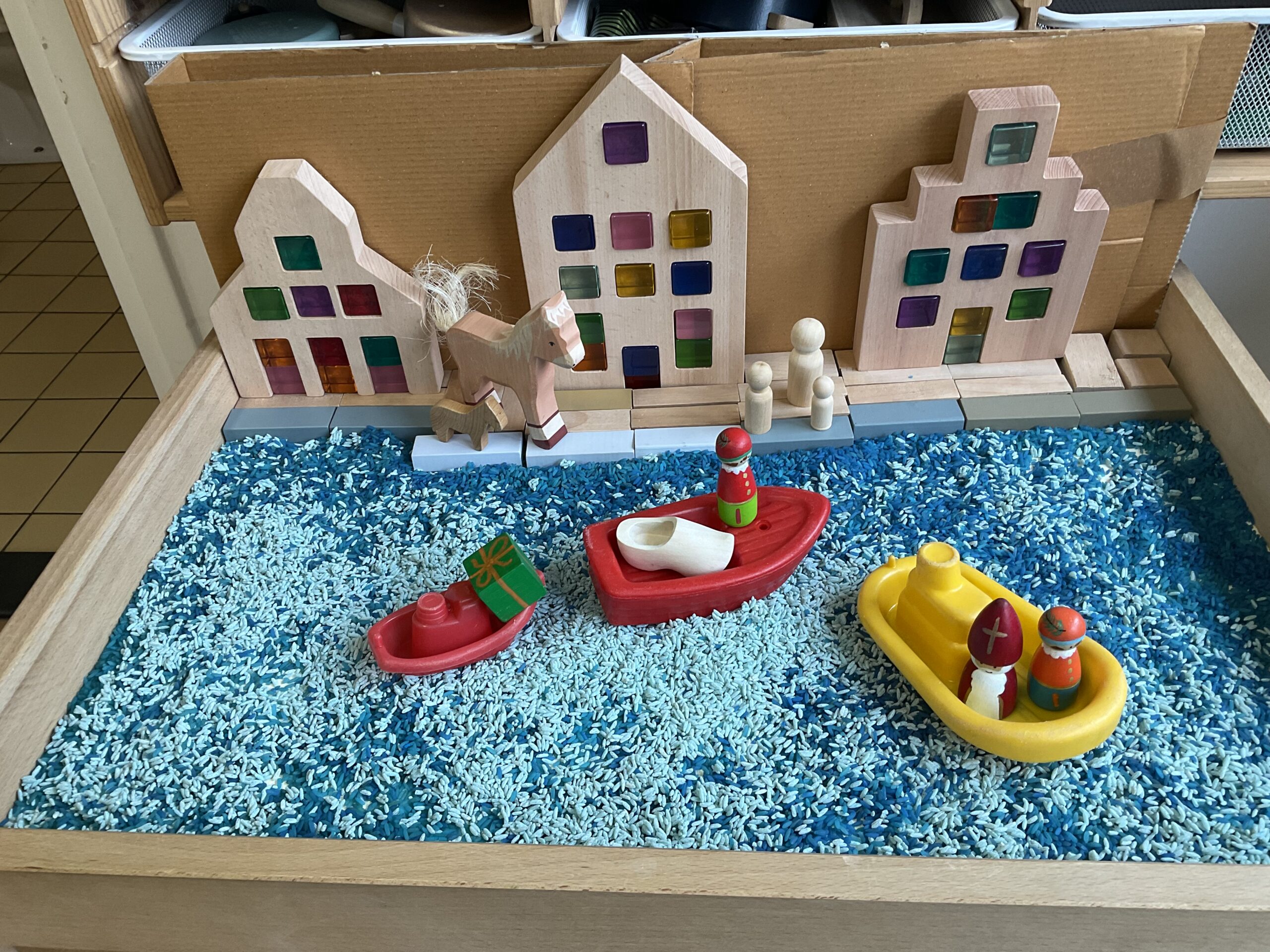 Sinterklaas en Piet zijn aangekomen met de boot uit Spanje! In onze senso-motorische bak beleven de kinderen dit avontuur opnieuw. Ze spelen heerlijk na hoe Sint en Piet aankomen.
