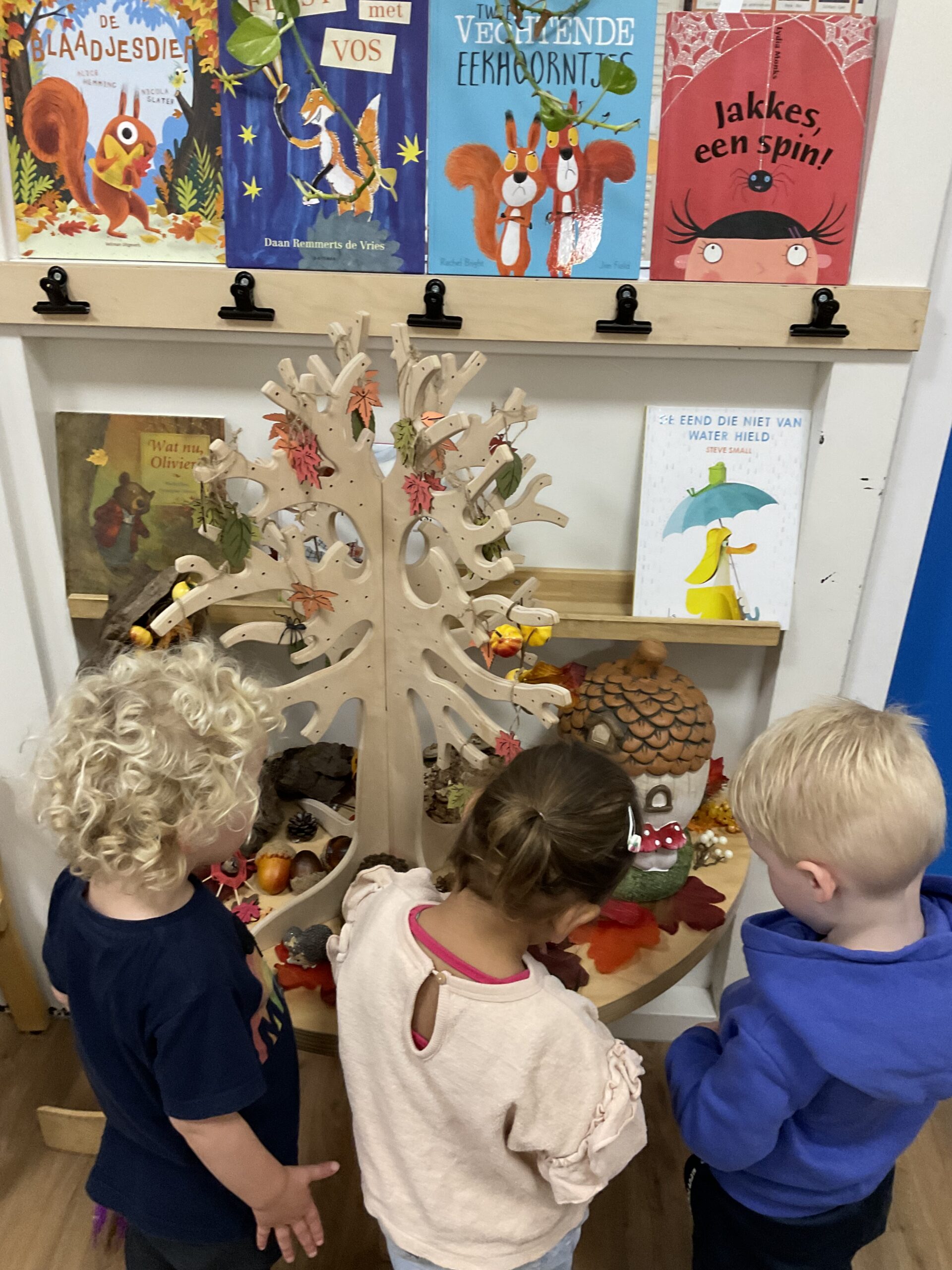 De kinderen kijken wat er allemaal te ontdekken is in de herfst. Spinnen, paddenstoelen, eikels, kastanjes en nog veel meer.