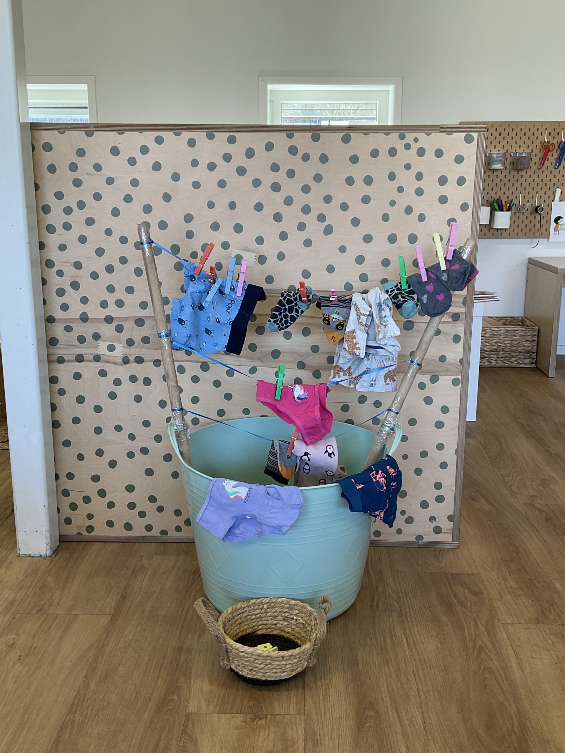 We hangen de was op met knijpers en leren ondertussen nieuwe woorden, zoals sokken, hemd en onderbroek.
