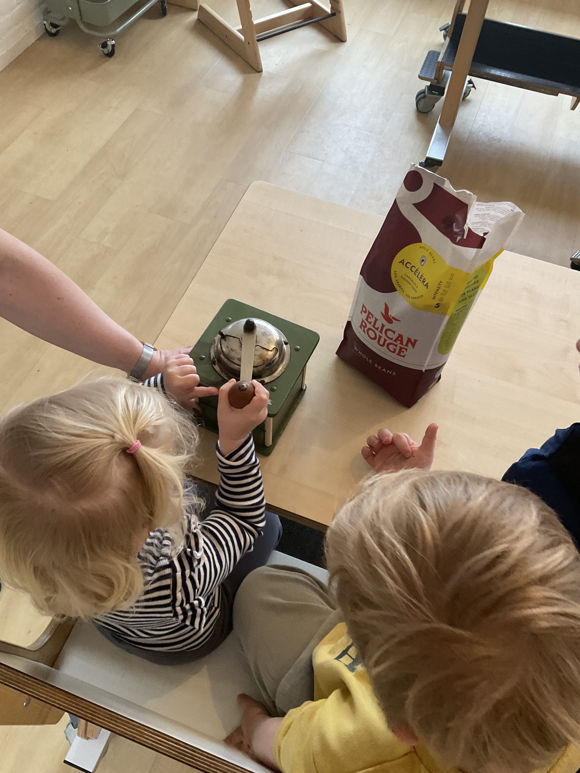 Binnen het thema kringloopwinkel bekijken we oude en nieuwe spullen. Vandaag testten we een oude koffiemolen. En ja hoor… het resultaat was versgemalen koffie. Mmm, wat rook dat lekker!