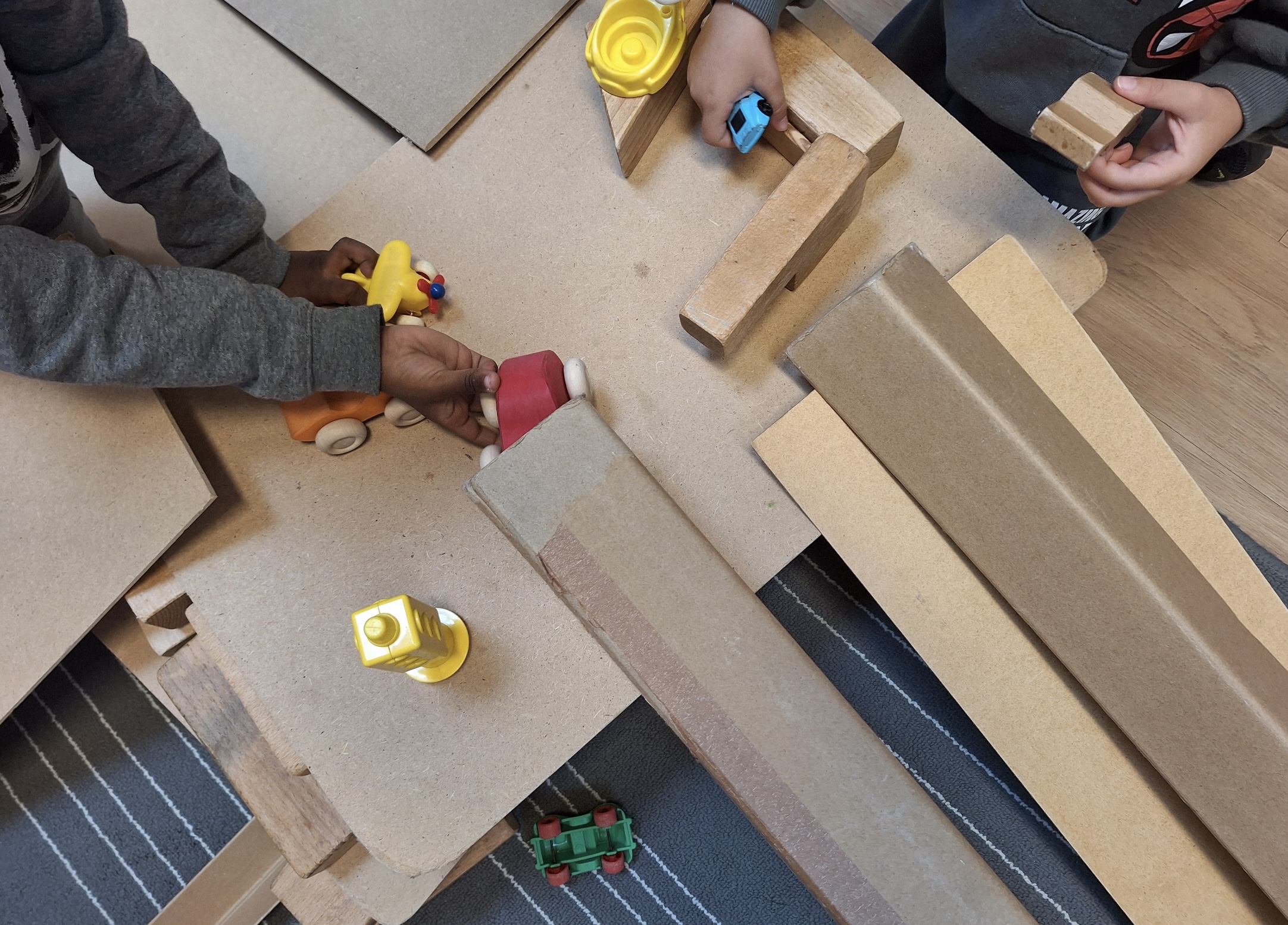 Aan de slag met losse houten planken, blokken en verschillende buizen. De kinderen bouwen hier aan aan parkeergarage. Hoe leuk is dat!