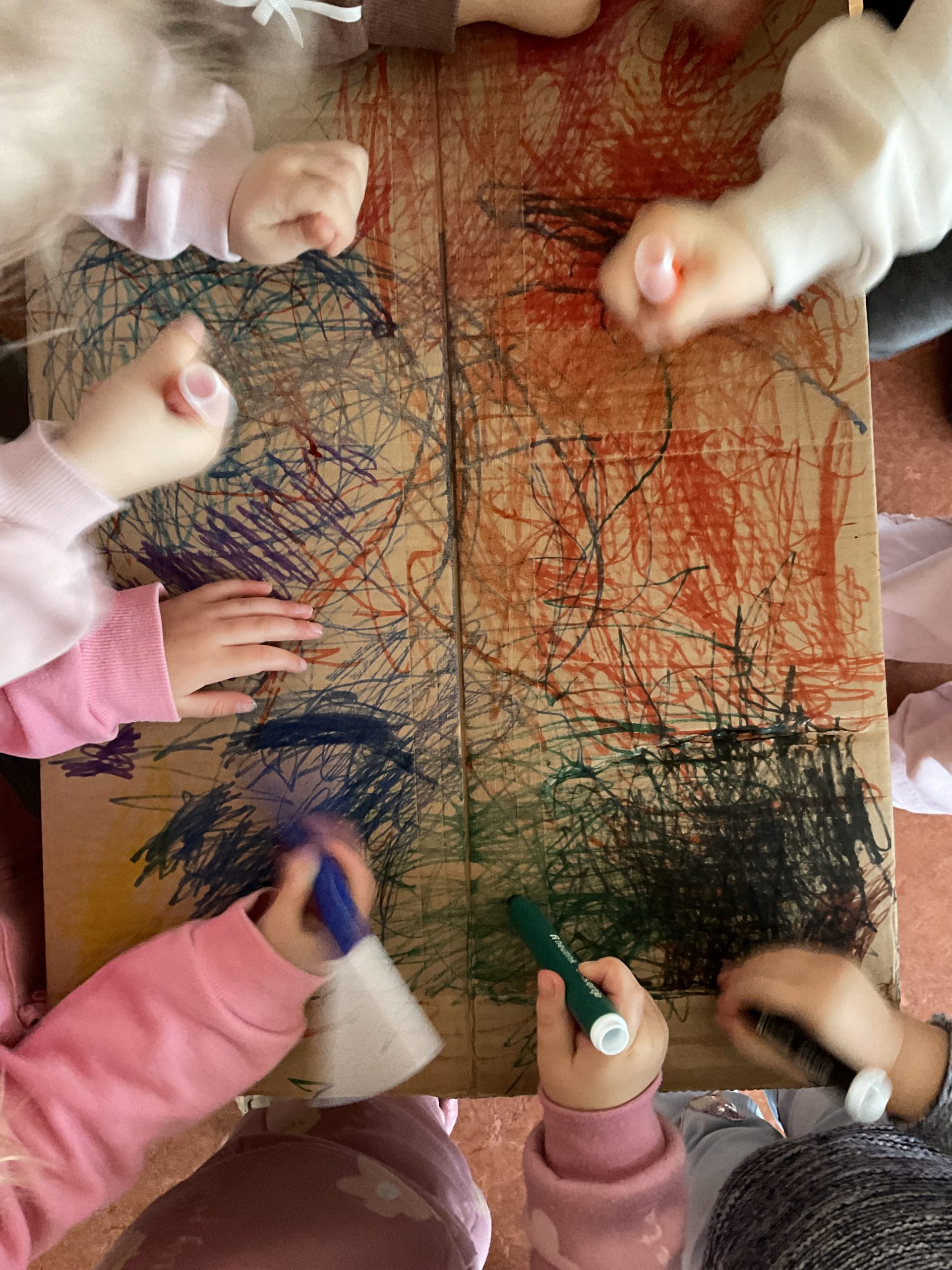 We hebben een grote doos. Daar maken we een huis van! Hij is nog een beetje saai, dus tijd om hem op te vrolijken. Dat doen we gezellig samen.