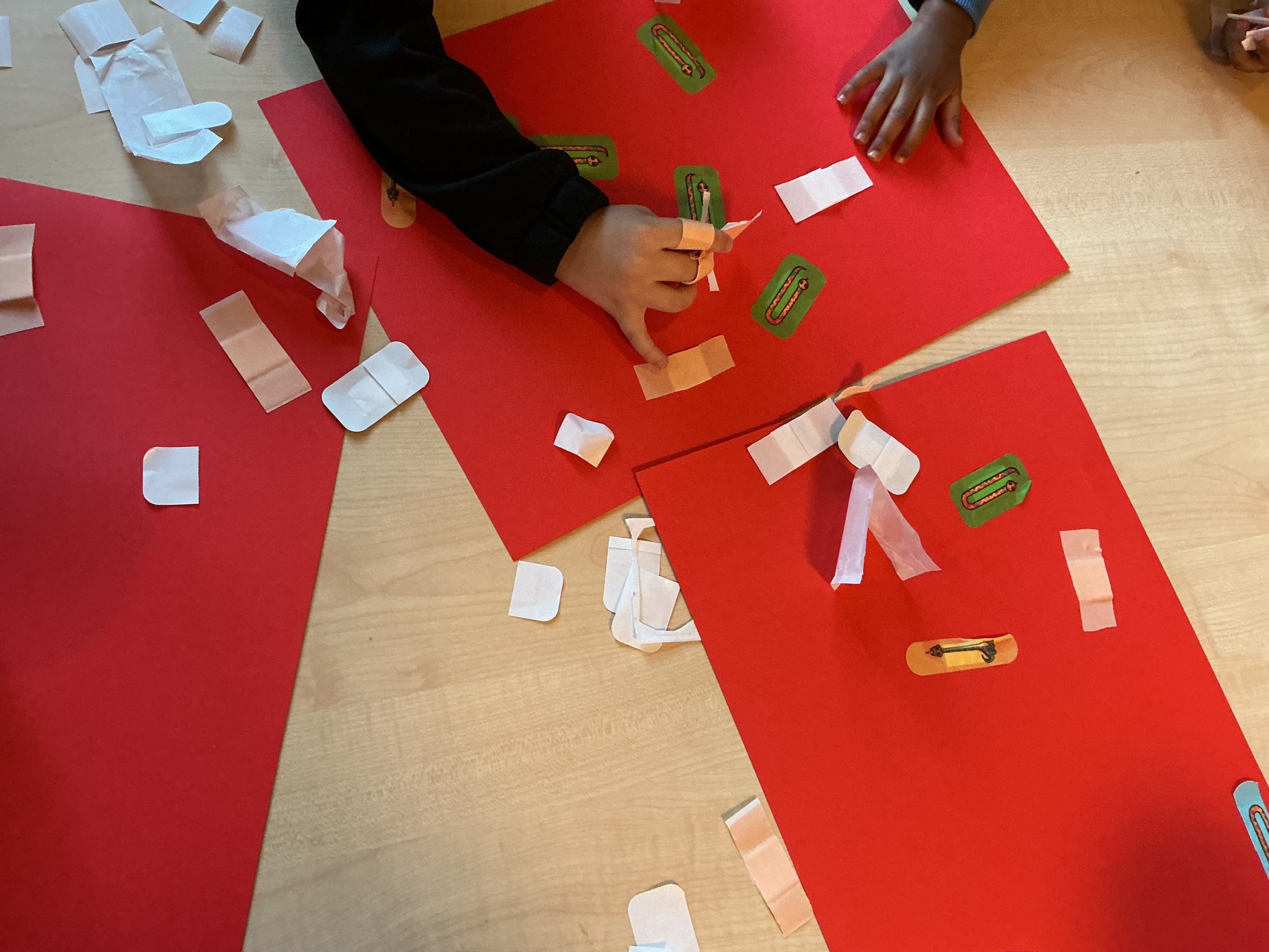 Wij zijn pleisters aan het plakken op papier en op onze eigen vingers.