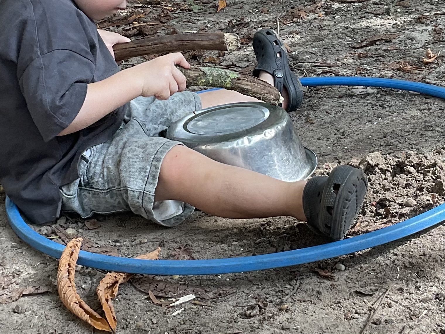 Hier vermaakt een jongen zich ontzettend goed met een kom en een stok. Hij trommelt er op los. Even later pakt hij de kom op, pakt zand en zoekt blaadjes. Hij heeft alweer een ander idee voor de kom.