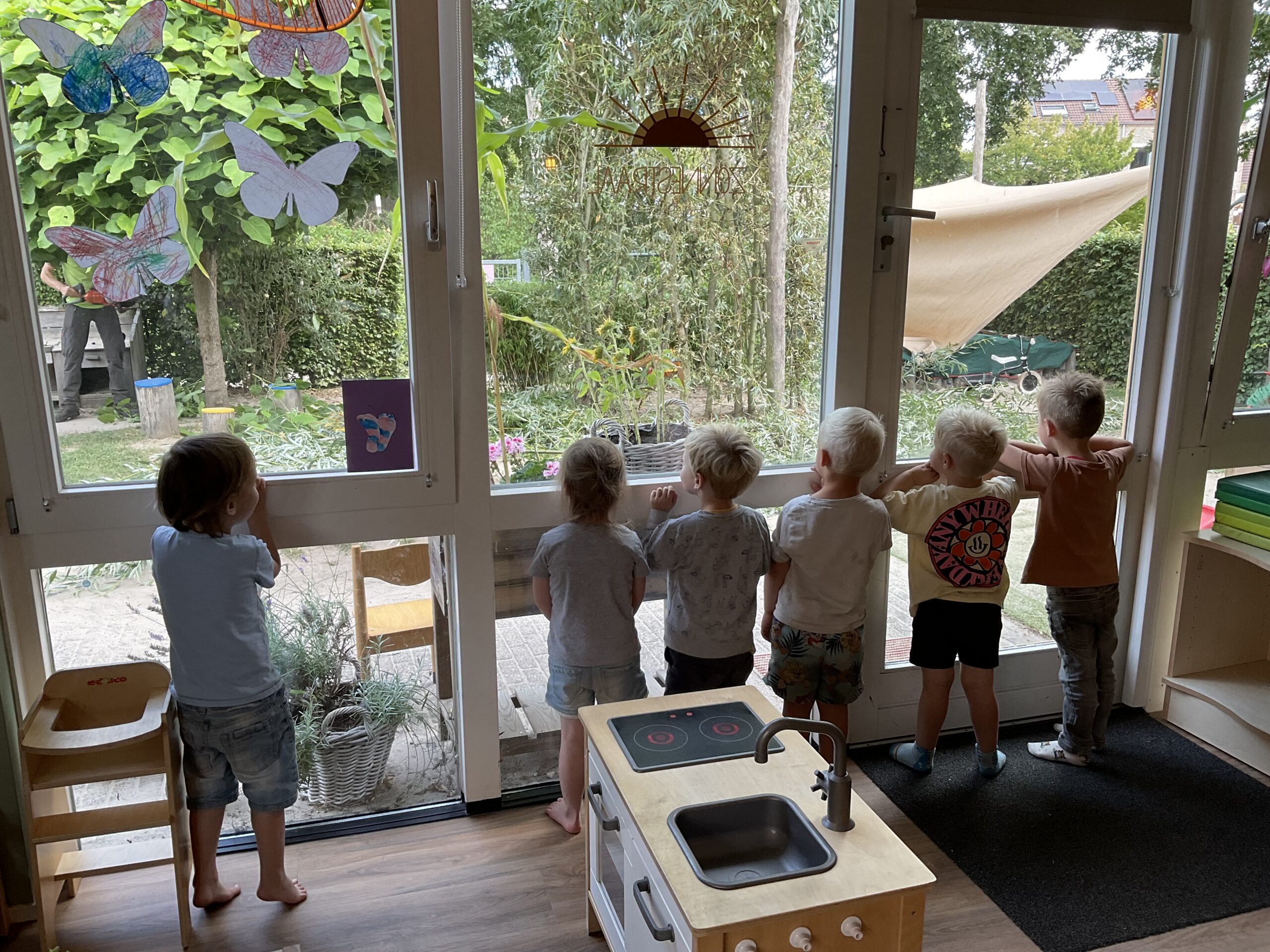 Alle kinderen kijken toe hoe de mannen van Donker Groen de tuin weer netjes maken, met grastrimmers, heggenscharen en bladblazers. Er is genoeg te zien en kijken. Voor de veiligheid staan we wel binnen.