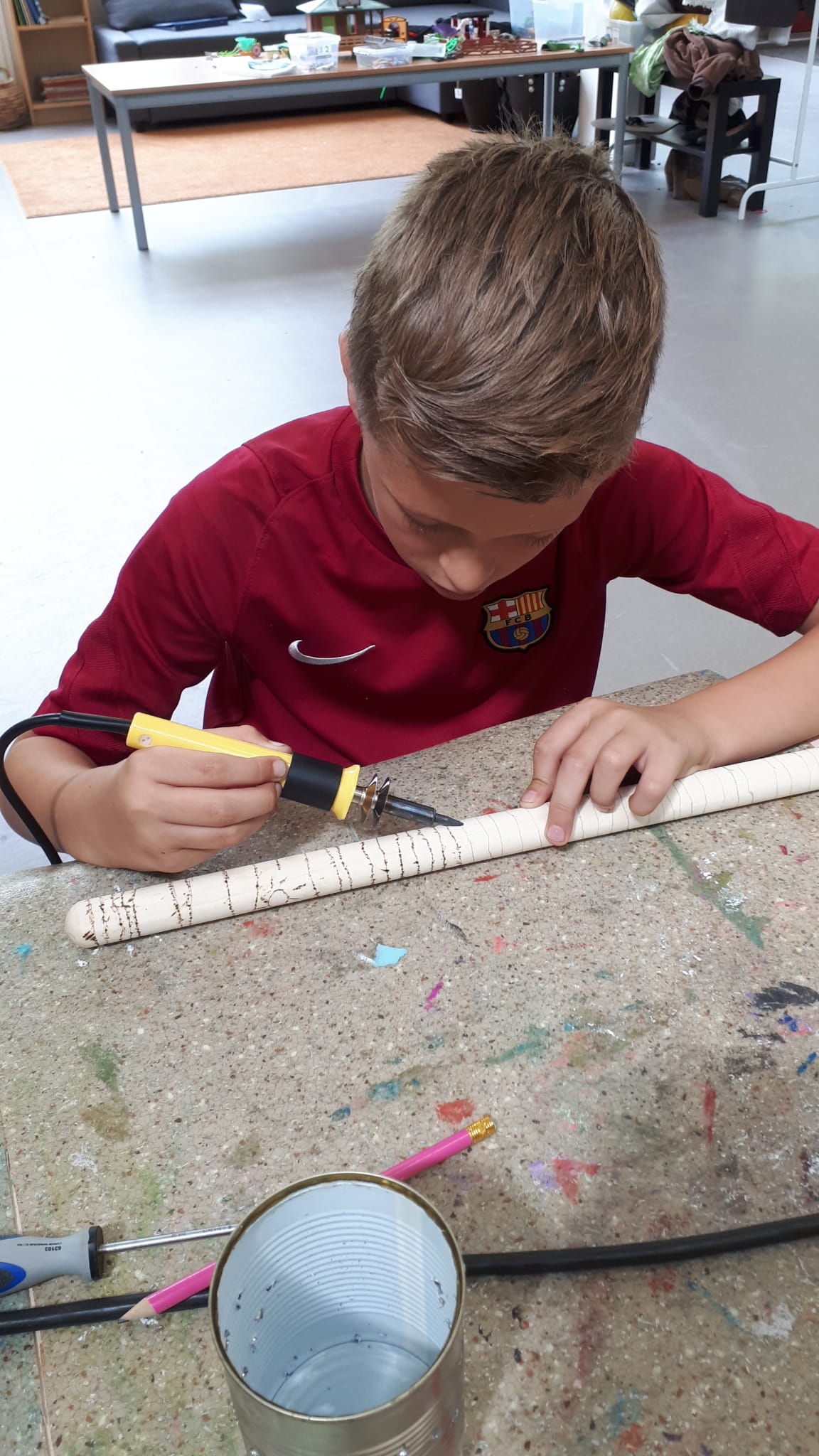 Met een houtbrander de stok versieren. Wauw wat werd het mooi.