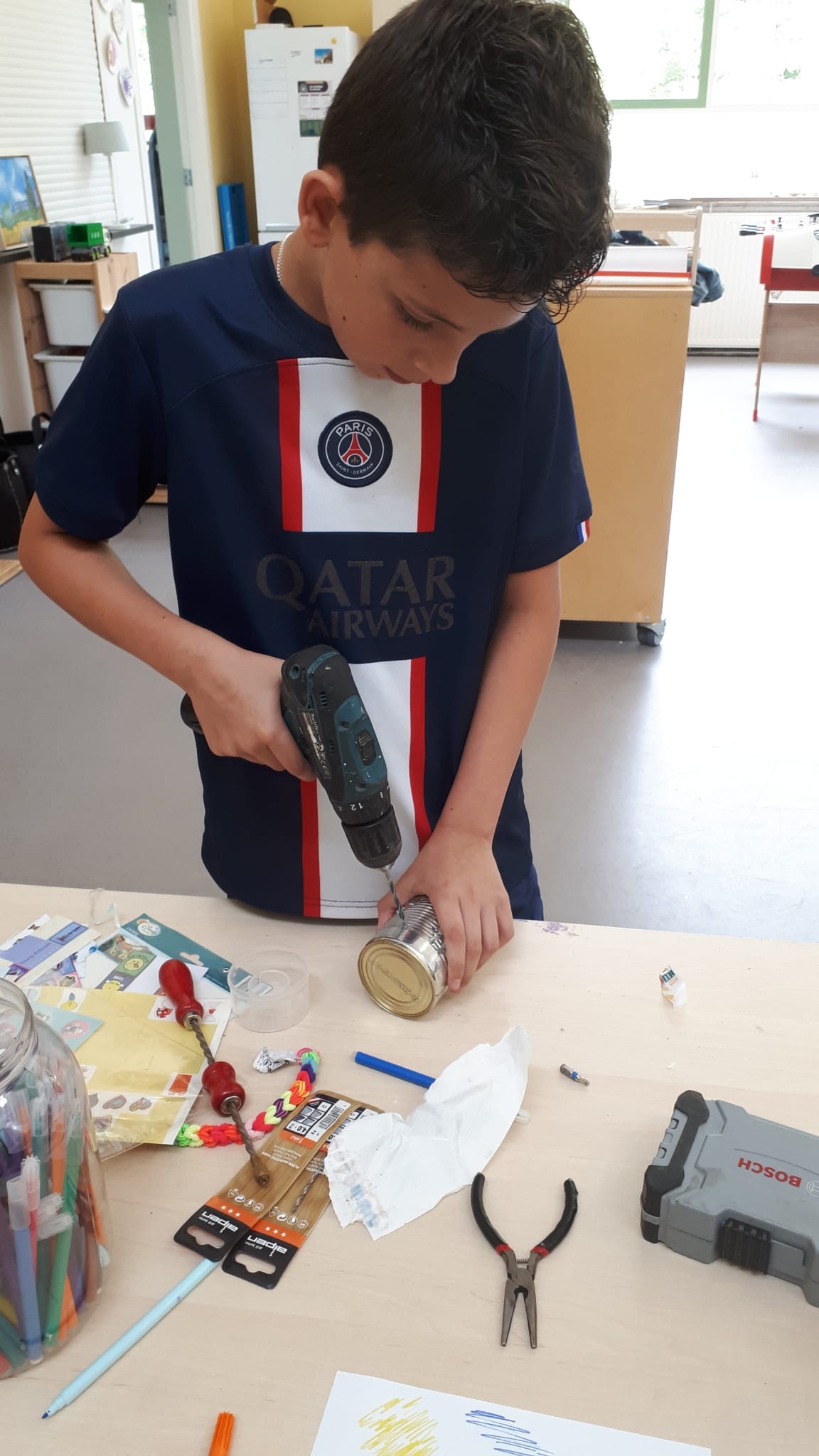 In blikken gaten boren en ze bevestigen op houten stokken, lampje erin en hij kan zo in de tuin. Even wachten tot het donker wordt en dan heb je echt een prachtig verlichte tuinfakkel.