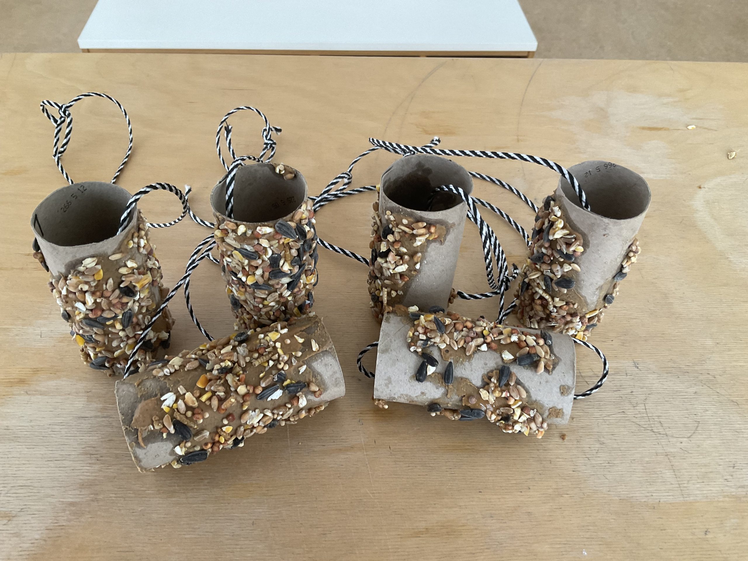 We hebben deze week wat lekkers voor de vogels gemaakt. De kinderen mochten pindakaas op een wc rol uitsmeren en daarna vogelzaad er over heen doen. Smikkelen maar in dit koude weer!