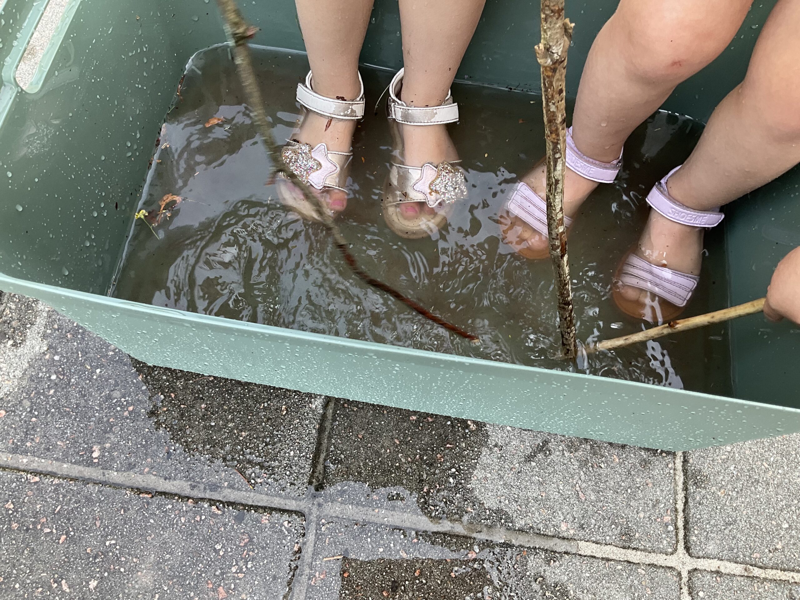 Het is vandaag erg warm en daar hoort natuurlijk waterpret bij. De sproeier staat aan en voor de kinderen die dat niet fijn vinden staat er een bak met water om heerlijk mee te spelen.