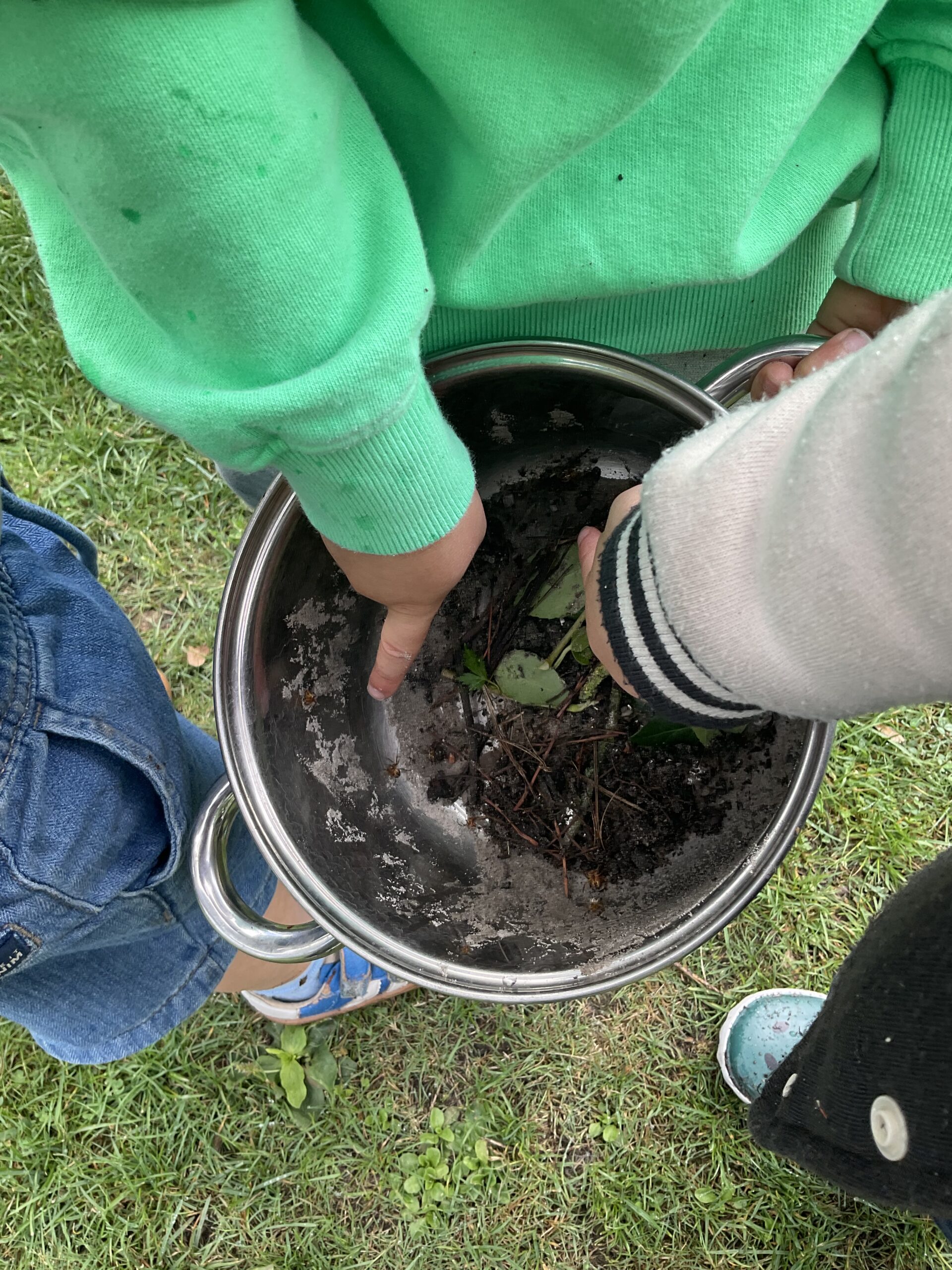 De kinderen zijn druk op zoek naar verschillende diertjes. Er zijn slakken, wormen, vlinders, pissebedden en heel veel spinnetjes. Ons pannetje is bijna vol daarna laten we ze weer vrij.