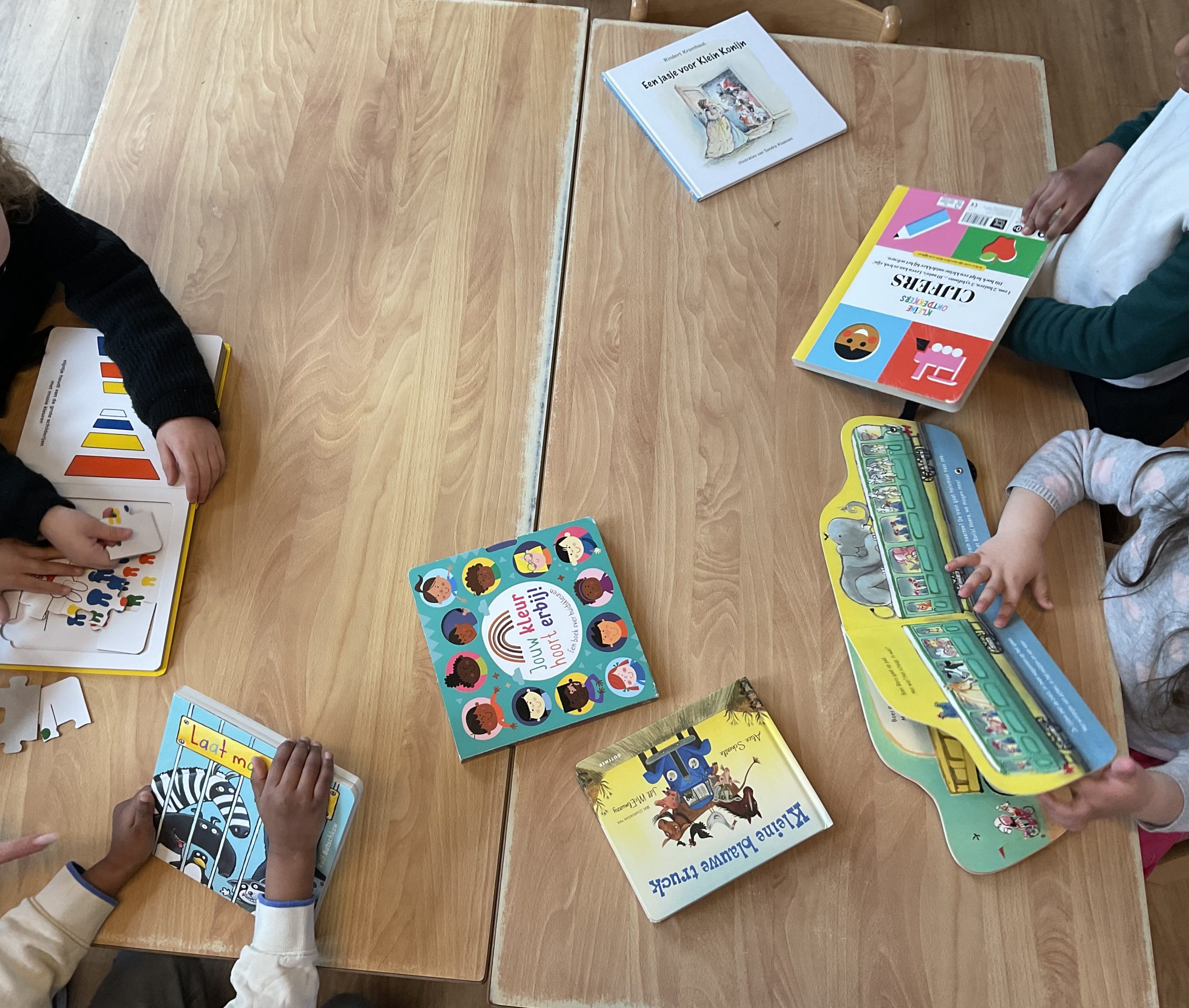 We maken bewust elke dag ruimte voor zelfstandig boeken lezen. Vaak gaan kinderen zelf eerst ontdekken, daarna laten ze boekjes aan ons zien en gaan we samen het verhaal lezen of vertellen.