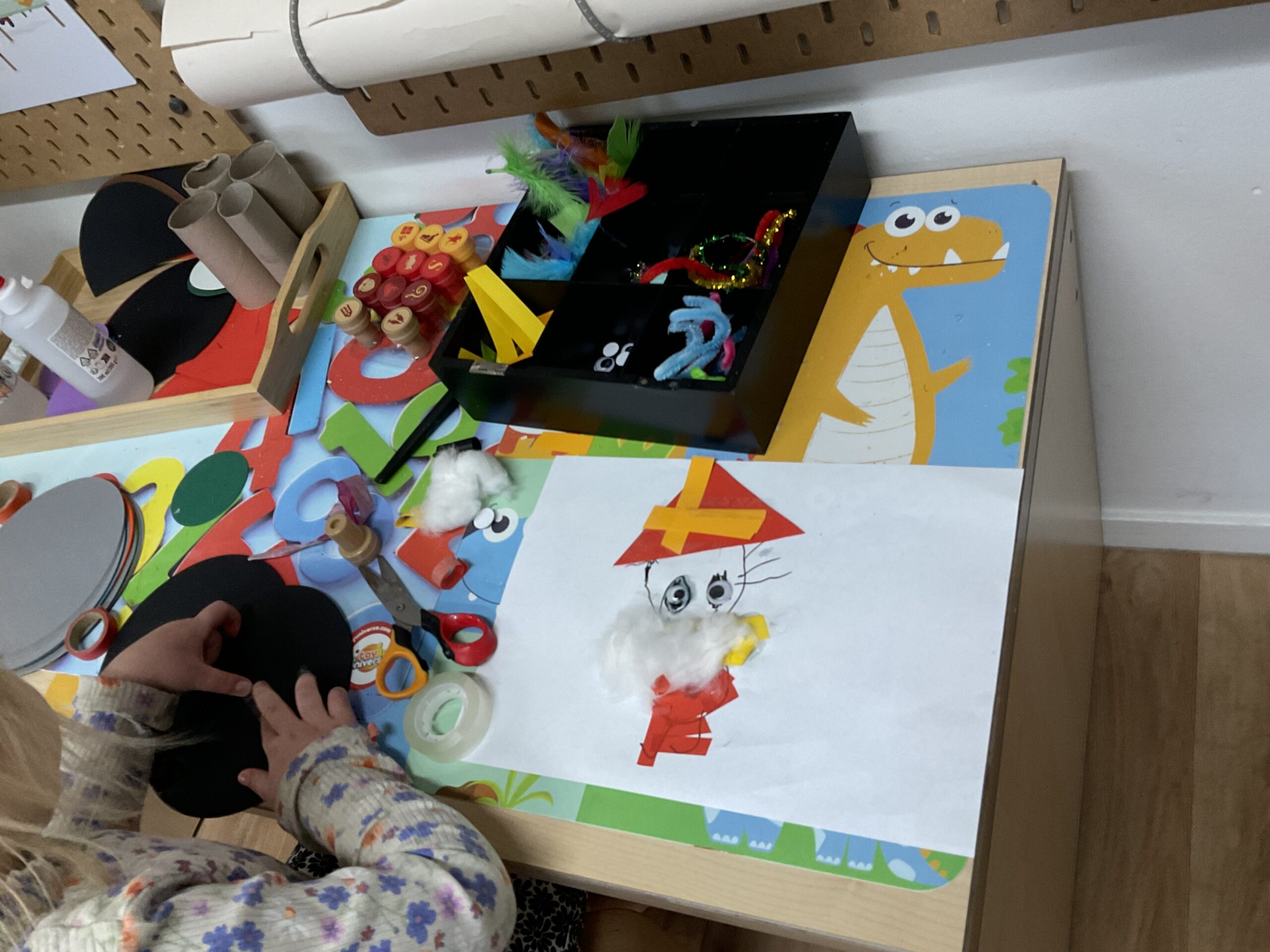 In het atelier ligt van allerlei materialen zoals watten, ogen, rood papier en stroken. Wat kun je er van maken? Laat dat maar aan de kinderen over!