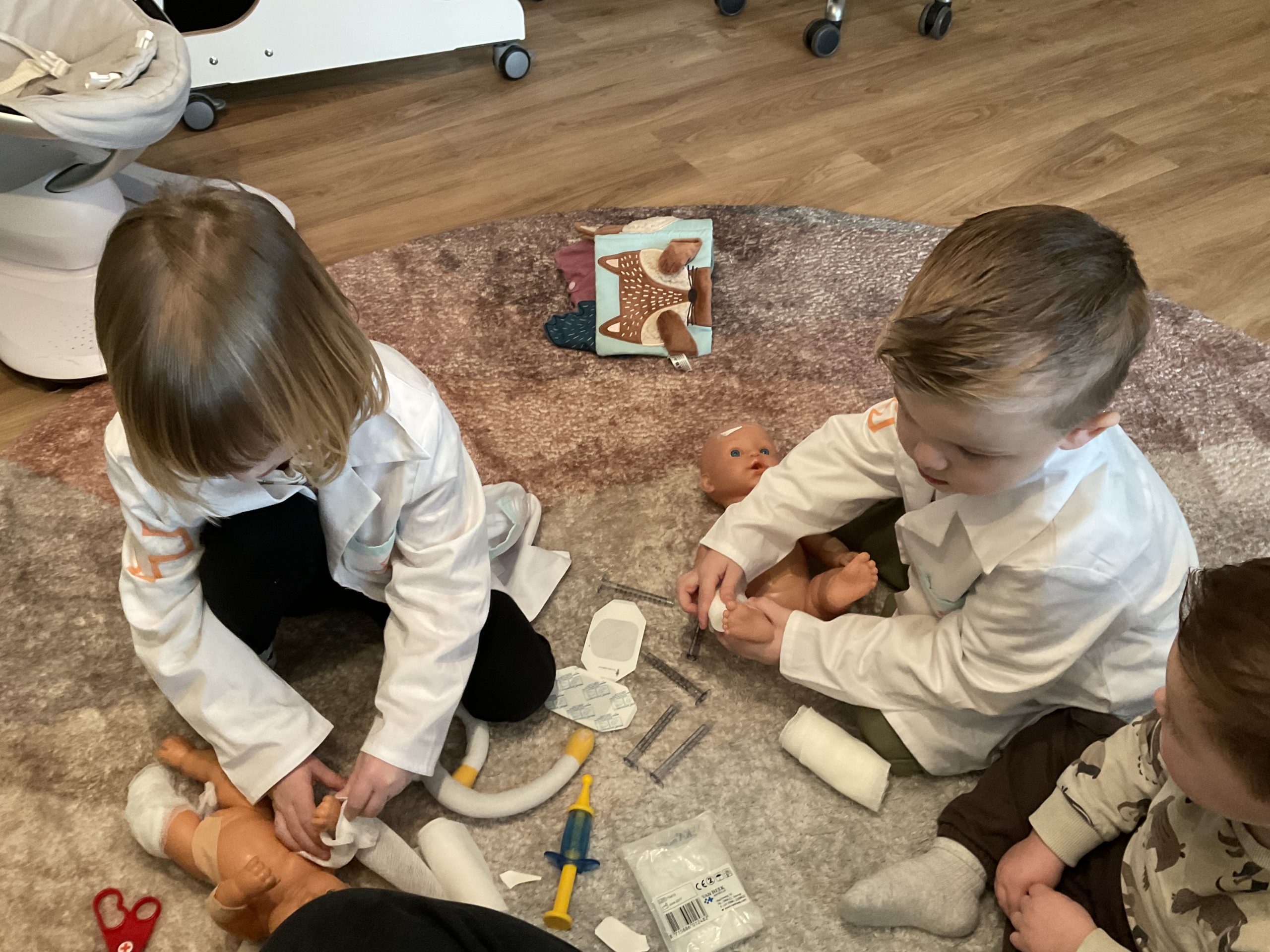 O nee, de popjes hebben zich pijn gedaan! Samen maken we ze weer beter. We knippen verbandjes en plakken pleisters. De jongere kinderen kijken aandachtig toe hoe onze dokters te werk gaan… wat interessant!