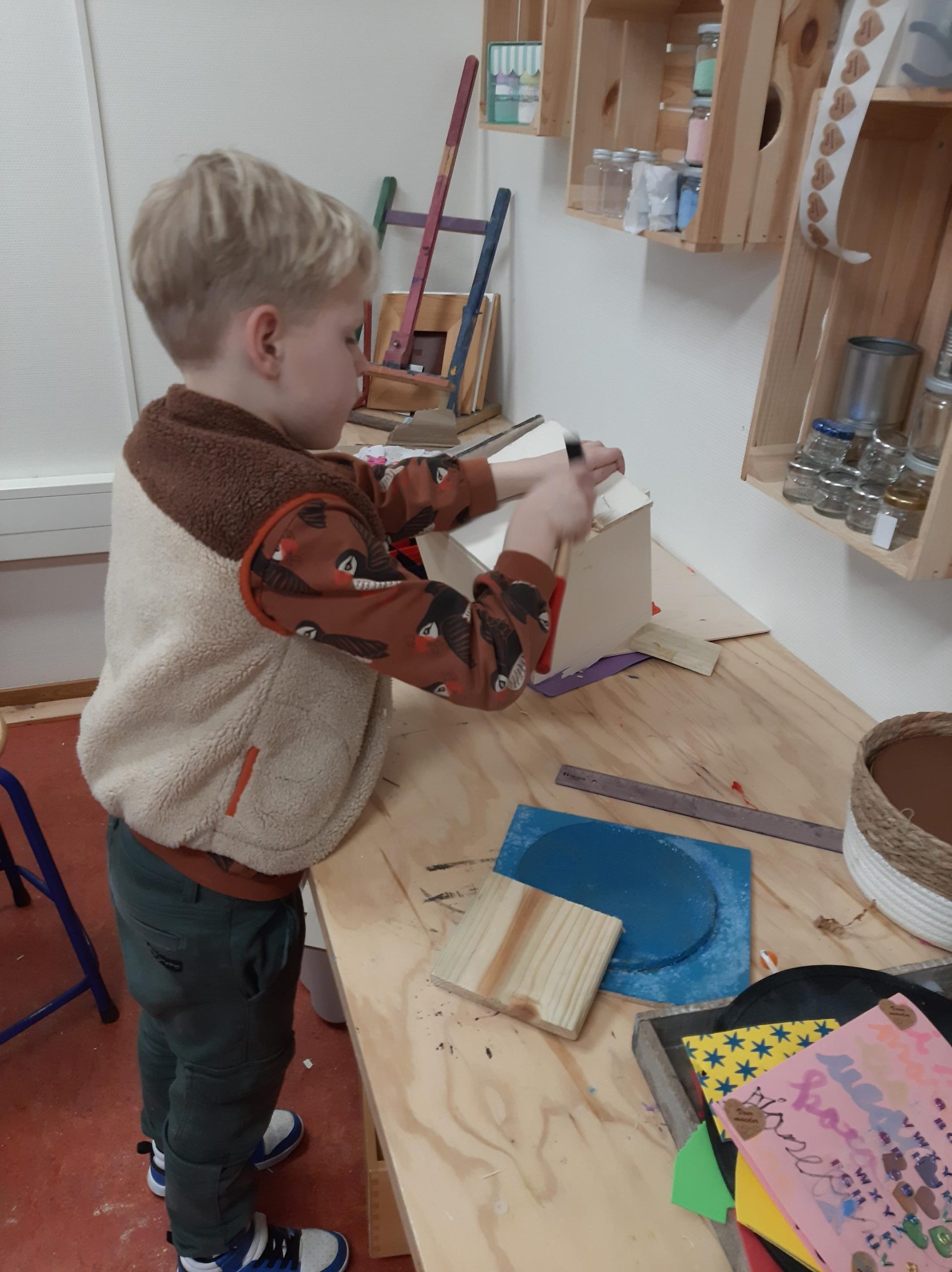 Wat kun je doen op een regenachtige middag, o.a. timmeren in het atelier.