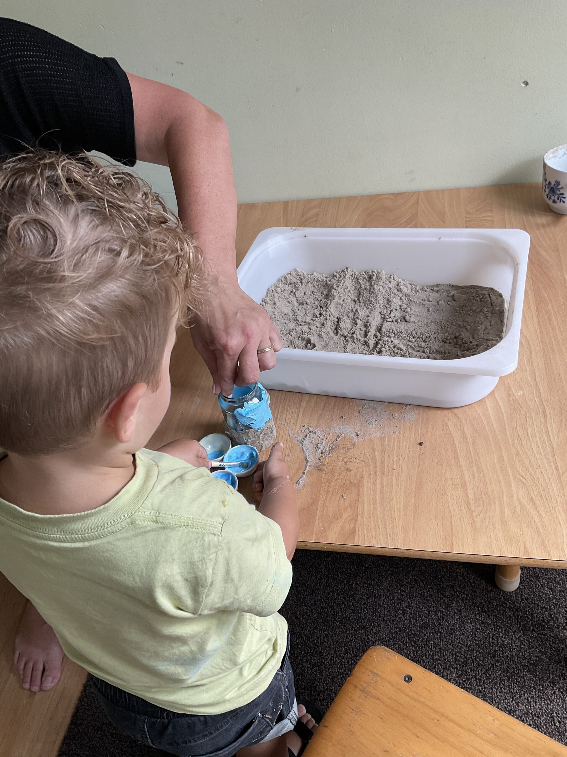 Wij maken leuke strandpotjes. Alleen nog schelpjes erin en dan is het klaar. Zo brengen wij de zomer in huis.