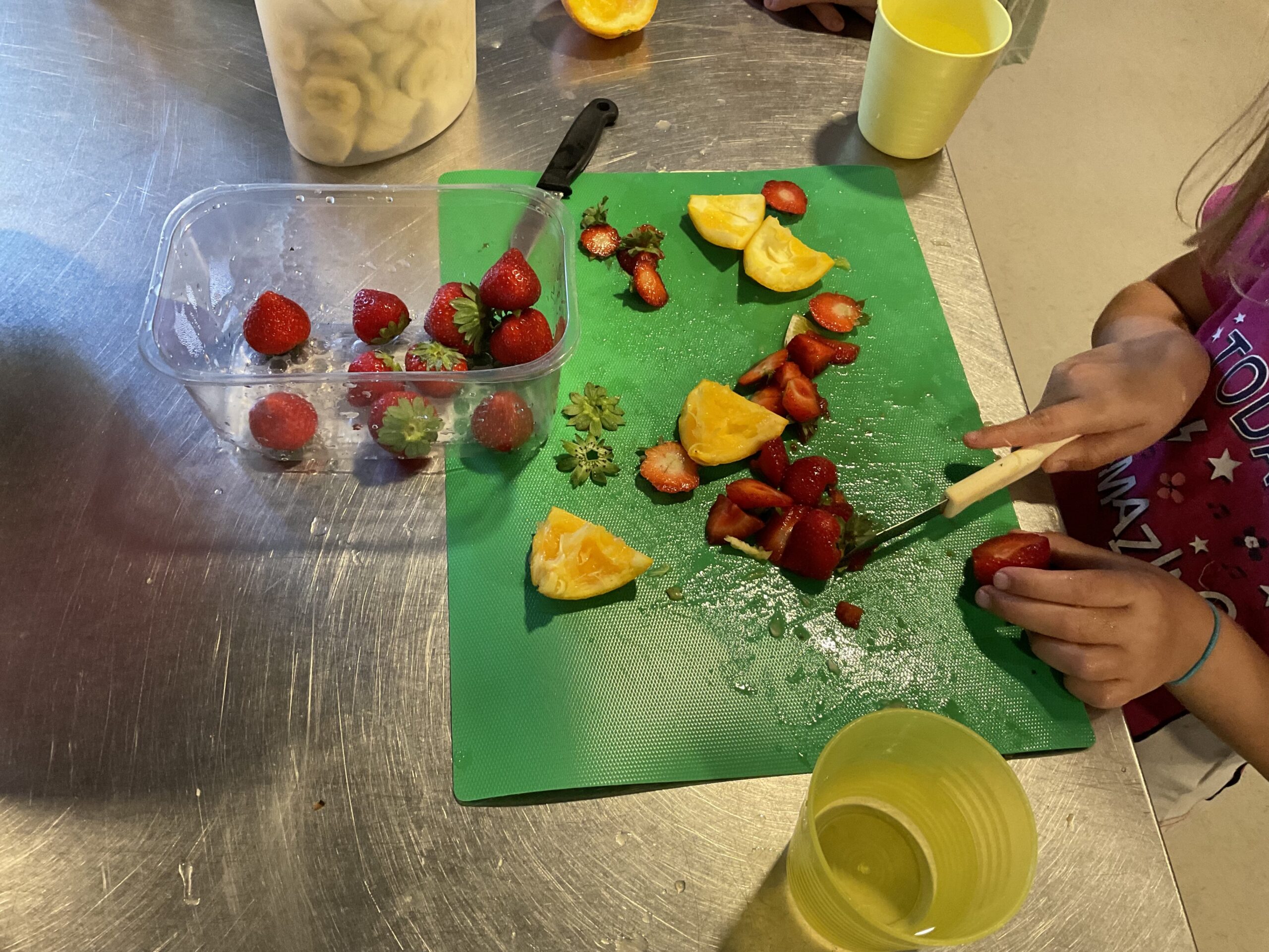We werken samen om lekkere frisse en gezonde mocktails te maken. We leren om te snijden met een scherp mes. In de blender en dan… smullen maar!
