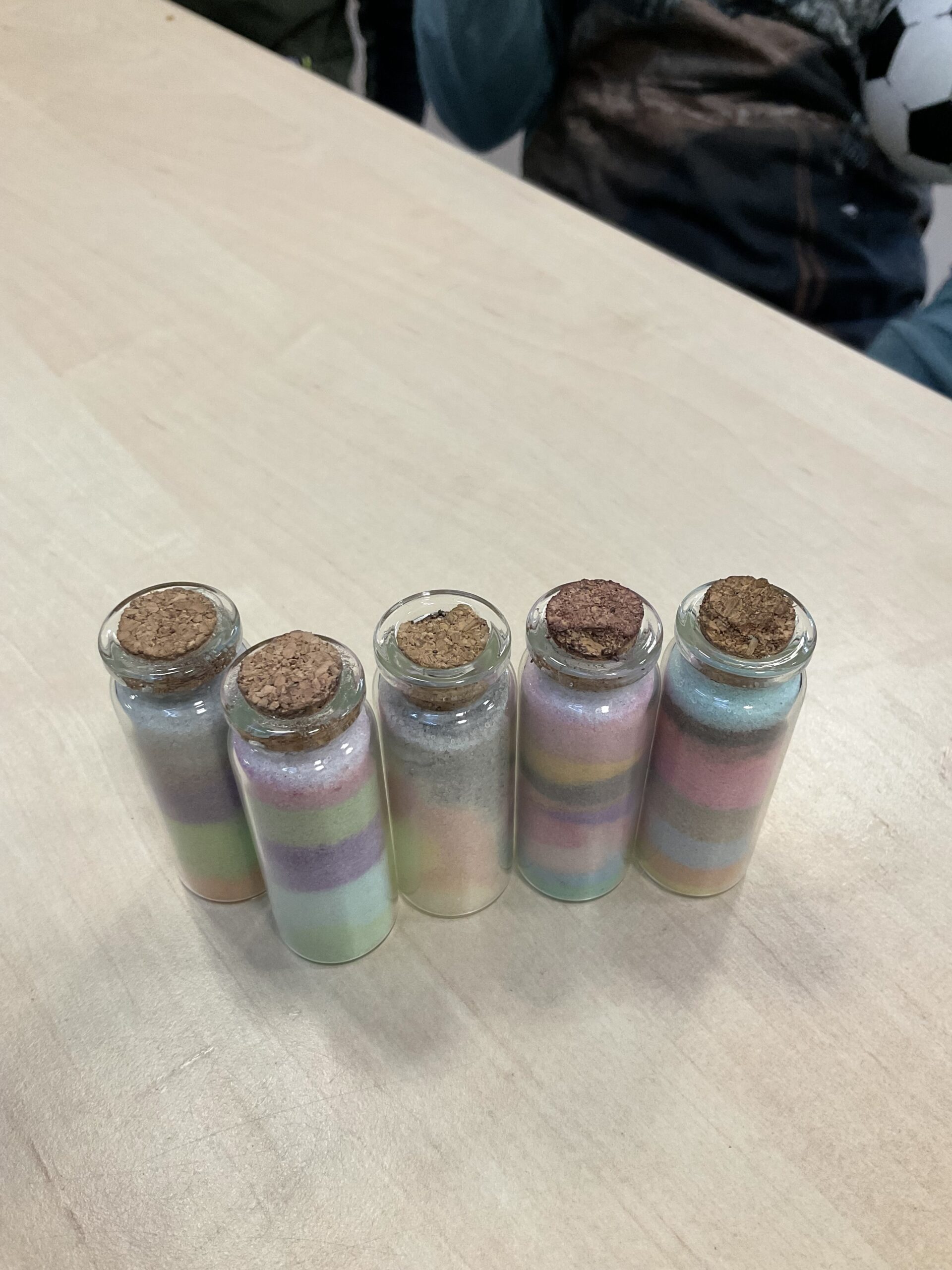 Vanmiddag hebben we met krijt zout gekleurd en zo ontstonden de mooiste zoutpotjes.