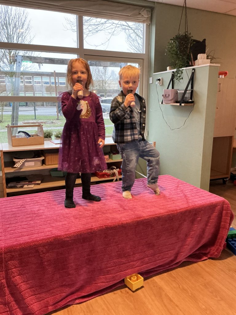 Met ons zelfgemaakte podium kunnen wij stralen. Een liedje kiezen en lekker mee zingen door de microfoon!