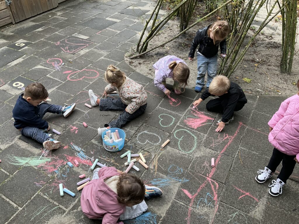 We vermaken ons binnen dus enorm goed. En dat geldt ook voor buiten, want daar is zóveel te doen en te beleven! Het grote, gezamenlijke plein heeft alle ruimte om te rennen en ravotten. Of voor een potje verstoppertje. Ook de zandbak is geliefd. Het is een wereld in het klein!