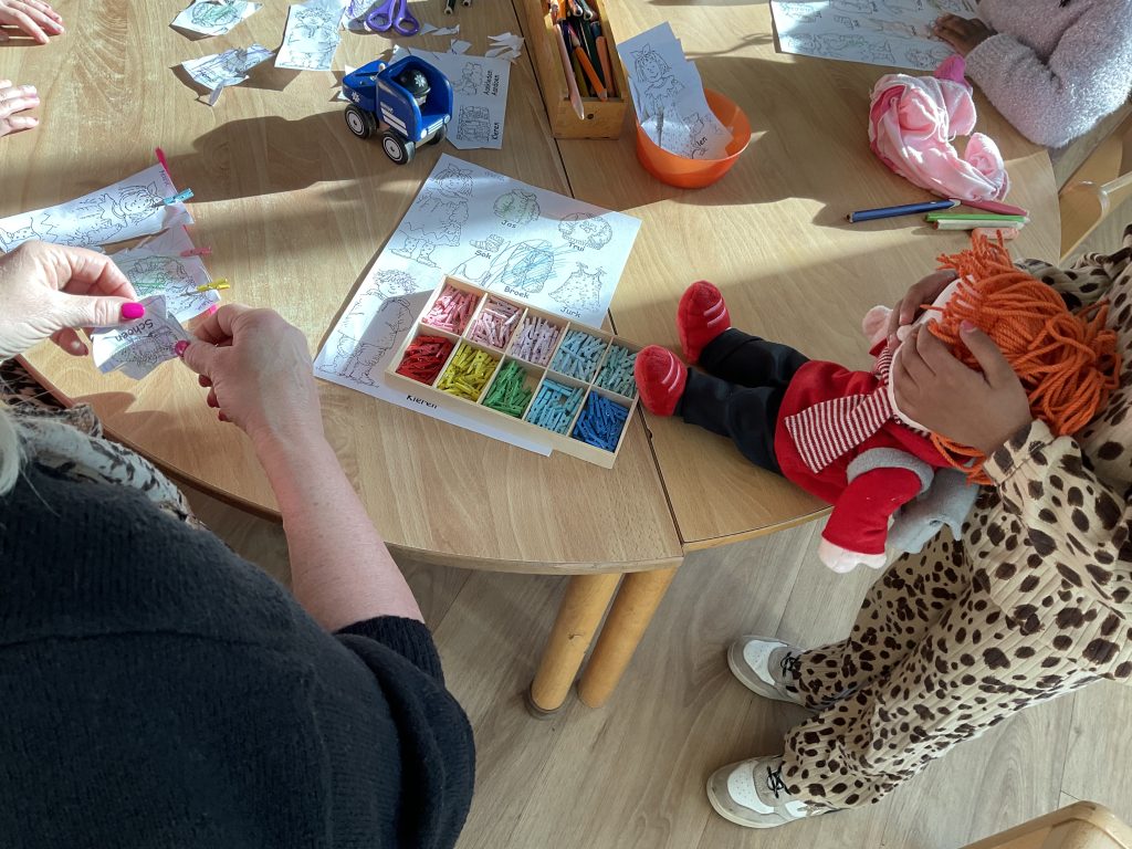 Pippa kijkt nieuwsgierig toe hoe juf Helen een waslijn maakt met kledingstukjes die de kinderen zelf hebben uitgeknipt. Nu nog kiezen: welke kleur wasknijpers gebruiken we?