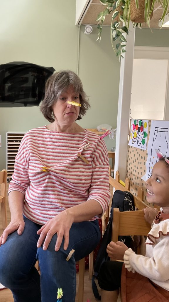 Vandaag kwam Daniëlla op bezoek. We zongen samen liedjes over knijpers, kleding, een hoedje van papier en zelfs over slangen die de was gingen ophangen!