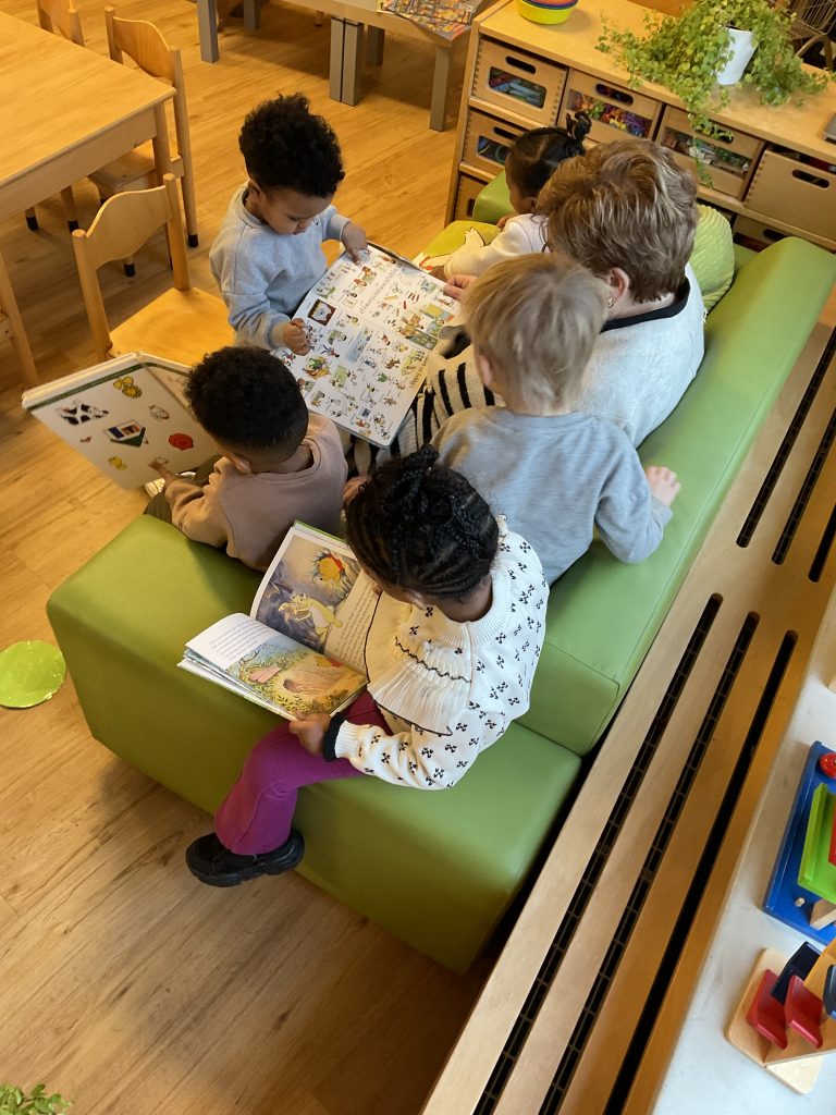 Al is de bank niet groot, toch zitten er vijf kinderen samen met de pp’er te lezen.